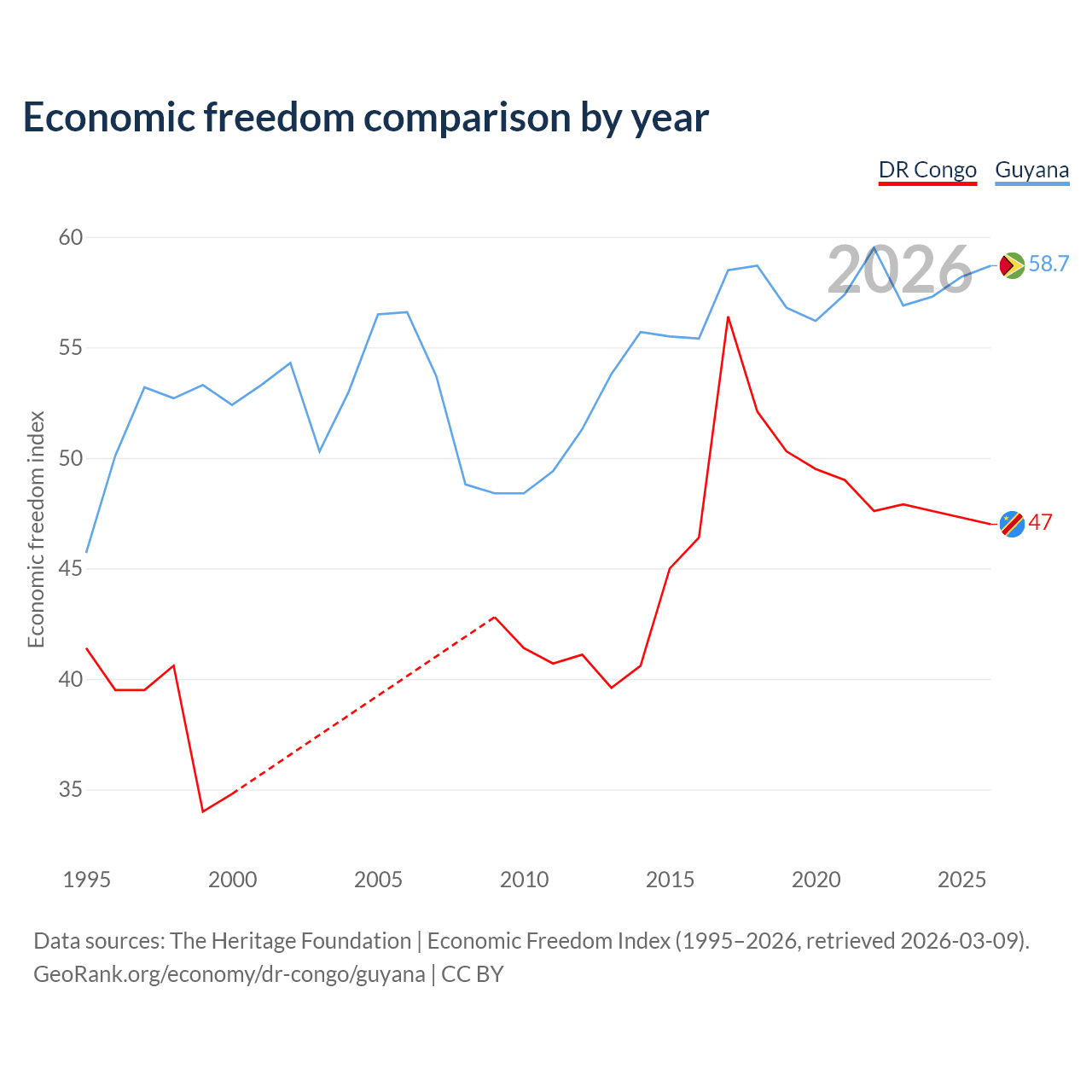 The Economic Freedom Index for the DR Congo is 47, ranking 176/197, compared to 58.7 for Guyana, ranking 109/197. The chart above displays a comparison of annual changes in economic freedom indexes.