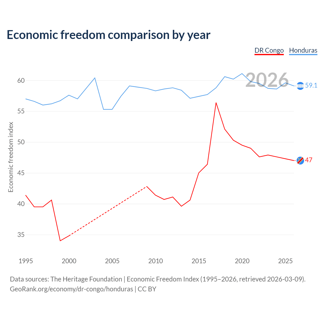 The Economic Freedom Index for the DR Congo is 47, ranking 176/197, compared to 59.1 for Honduras, ranking 105/197. The chart above displays a comparison of annual changes in economic freedom indexes.