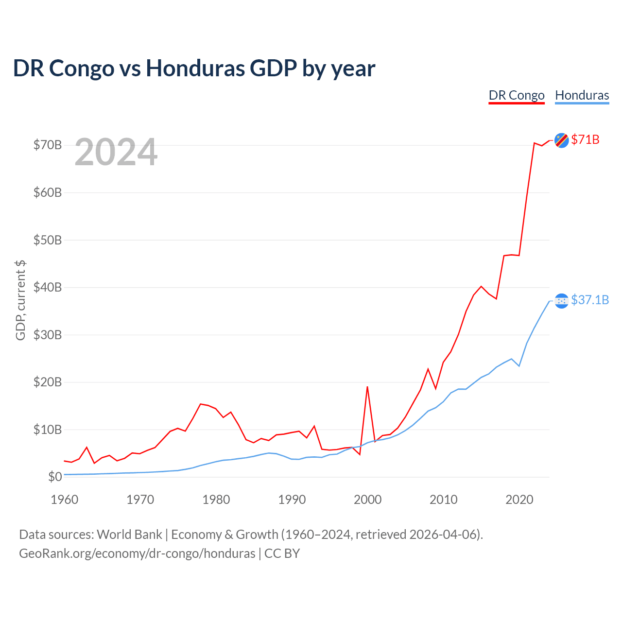 The DR Congo has a GDP of $71B compared to $37.1B for Honduras, ranking 87/197 and 104/197 by economy size, respectively.