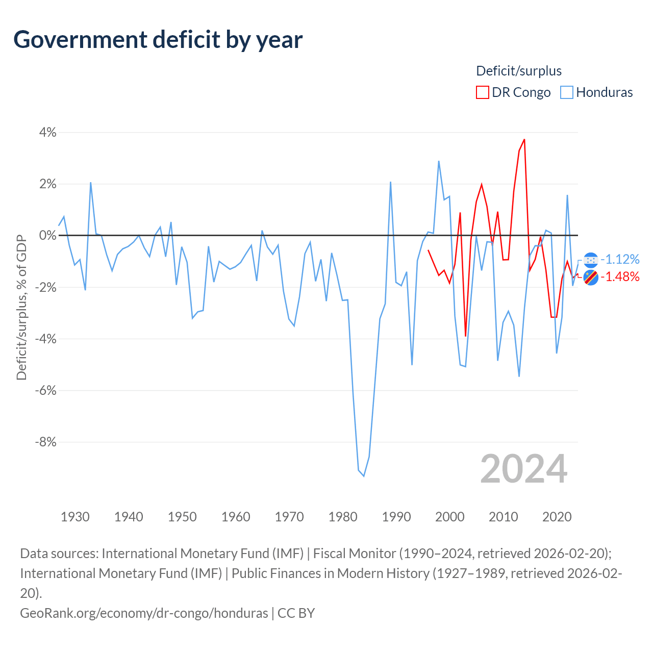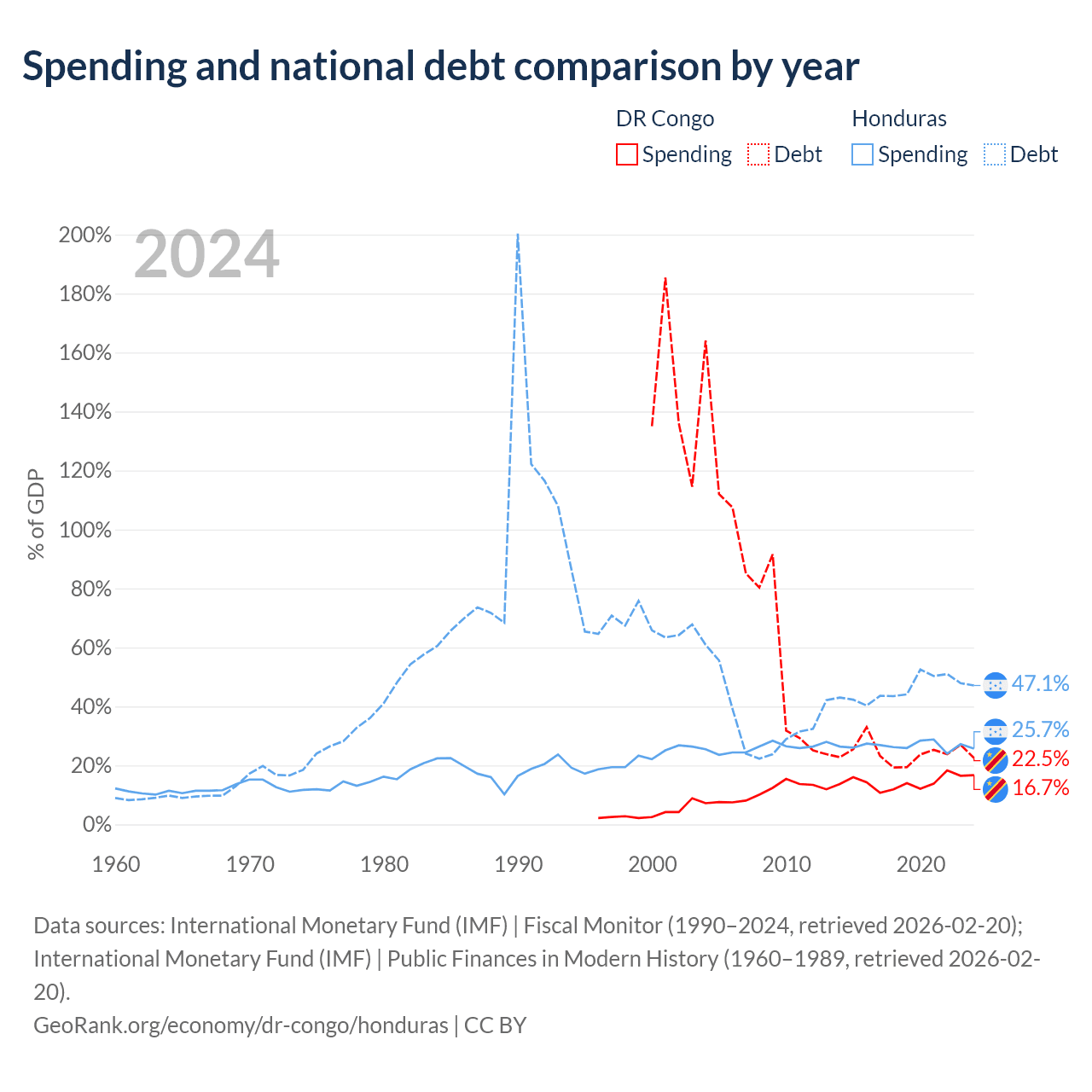 The DR Congo has $16B in government debt (22.5% of GDP), compared to $17.5B (47.1% of GDP) in Honduras.