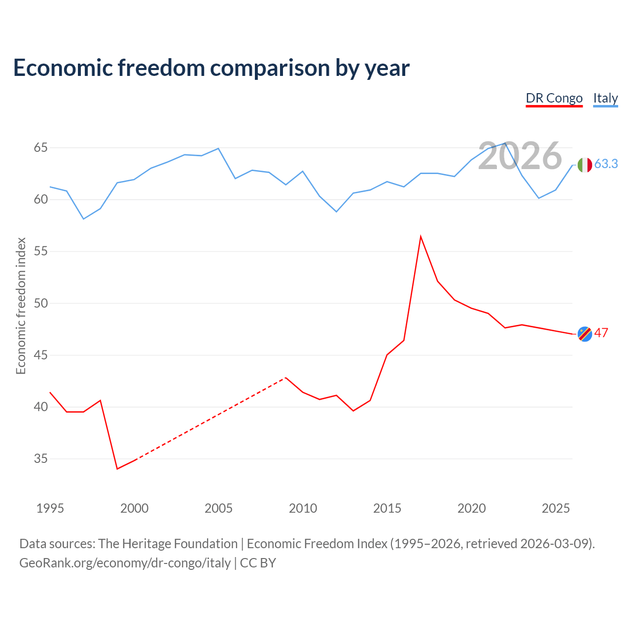 The Economic Freedom Index for the DR Congo is 47, ranking 176/197, compared to 63.3 for Italy, ranking 80/197. The chart above displays a comparison of annual changes in economic freedom indexes.