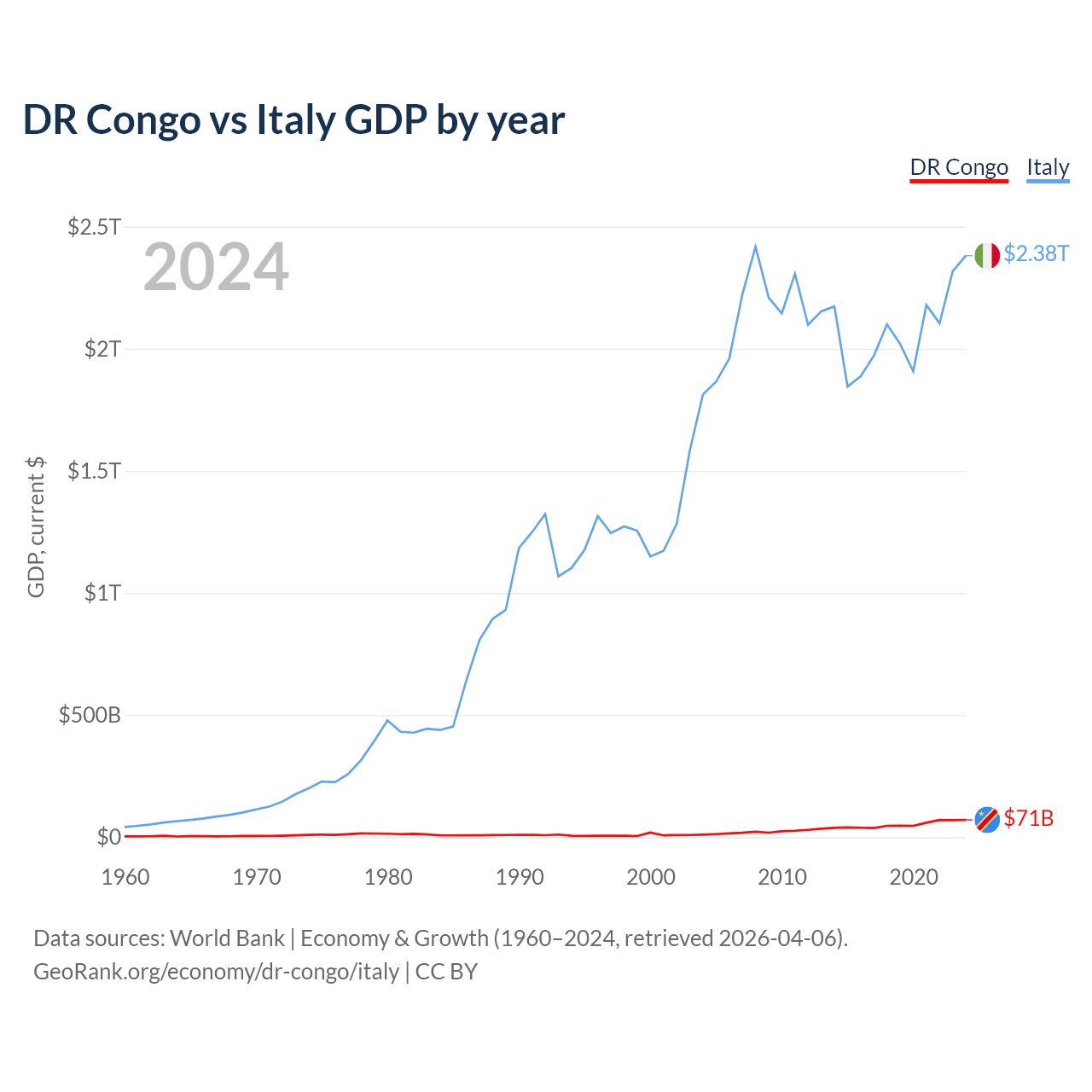 The DR Congo has a GDP of $71B compared to $2.38T for Italy, ranking 87/197 and 8/197 by economy size, respectively.