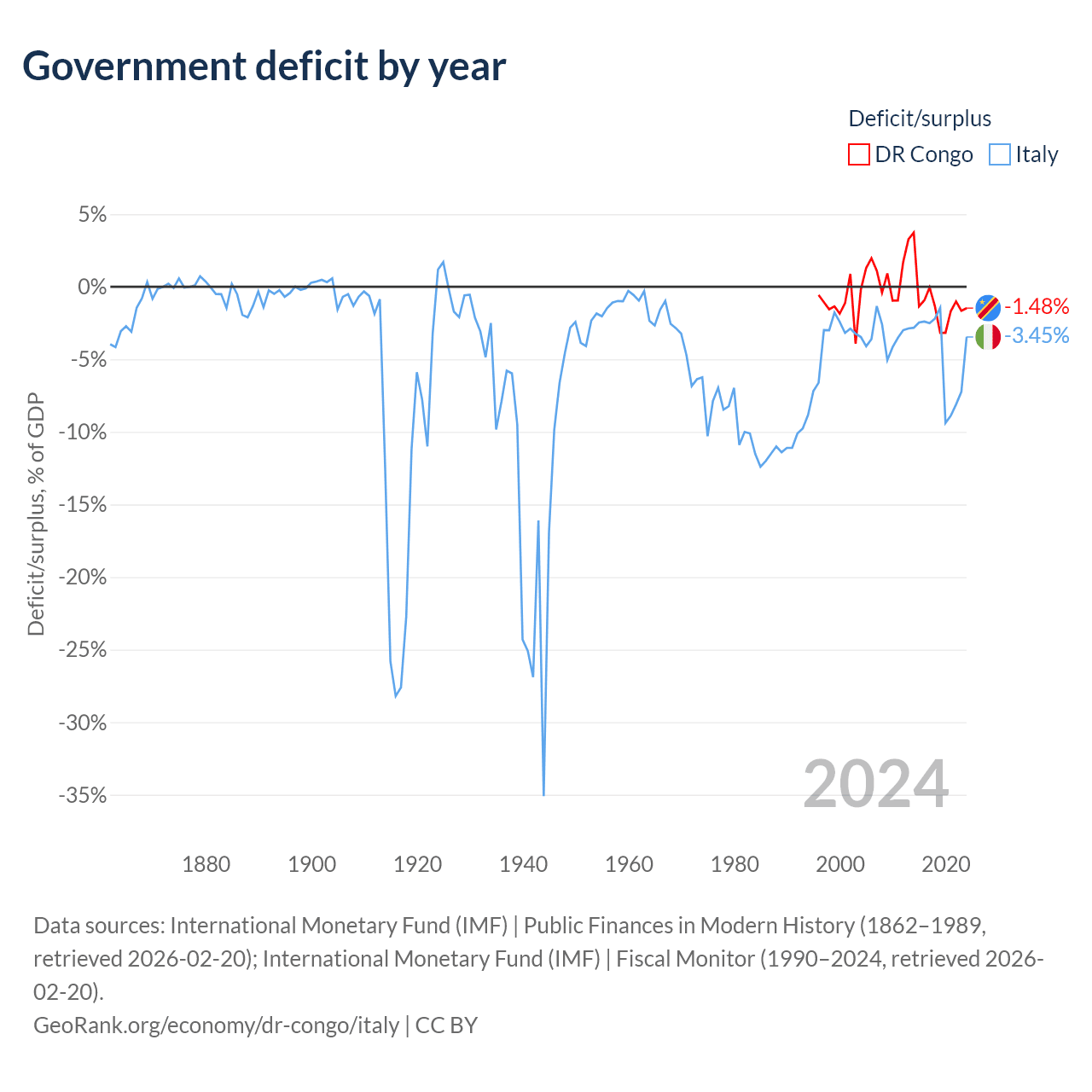 The DR Congo has $16B in government debt (22.5% of GDP), compared to $3.22T (135.3% of GDP) in Italy.