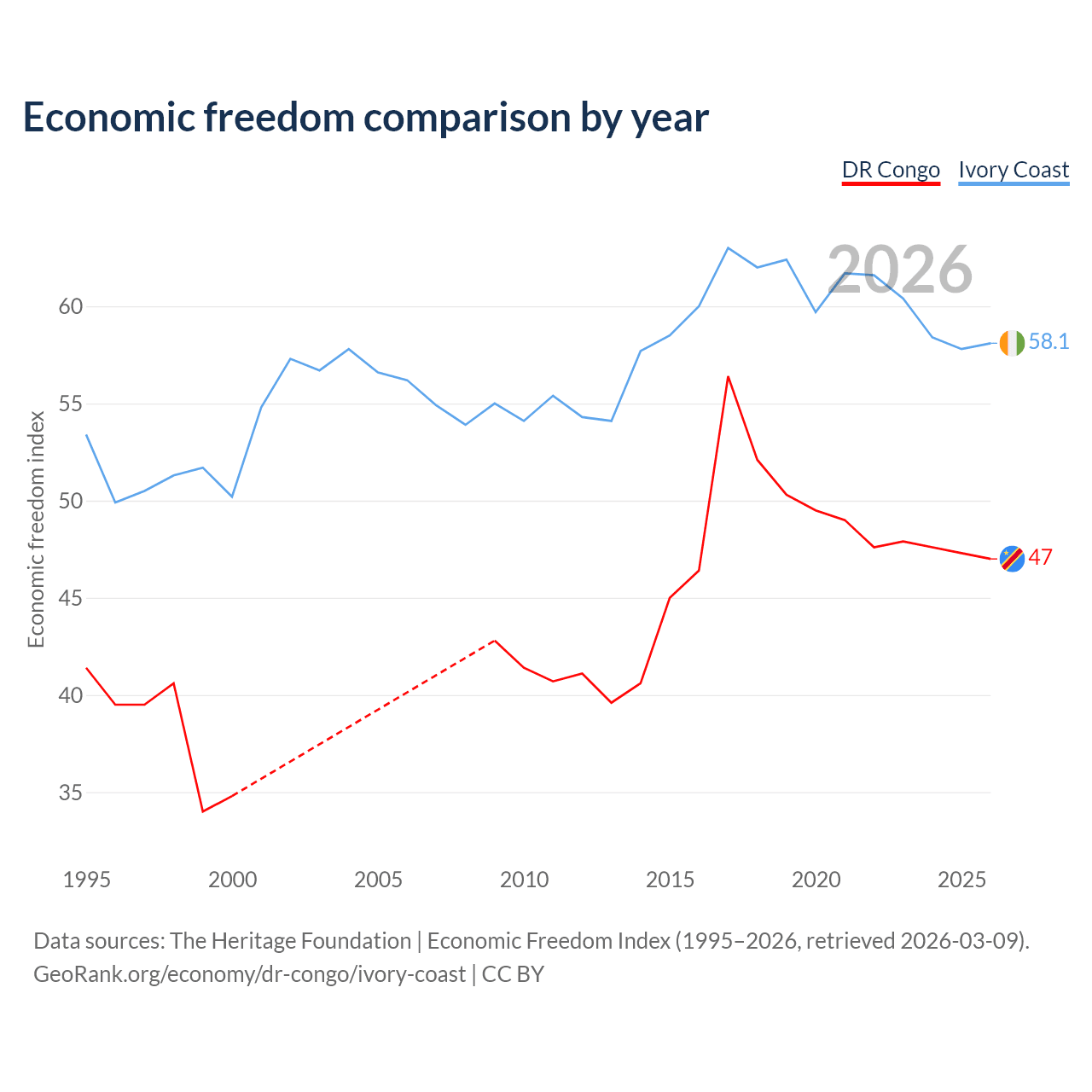 The Economic Freedom Index for the DR Congo is 47, ranking 176/197, compared to 58.1 for Ivory Coast, ranking 111/197. The chart above displays a comparison of annual changes in economic freedom indexes.