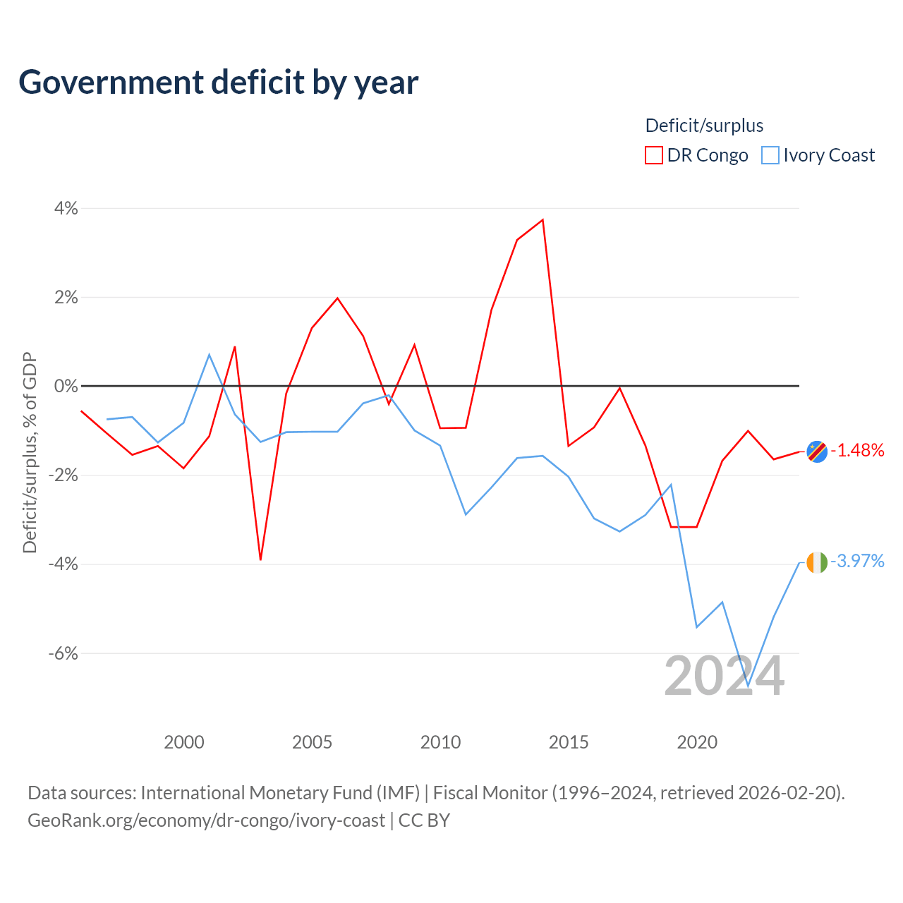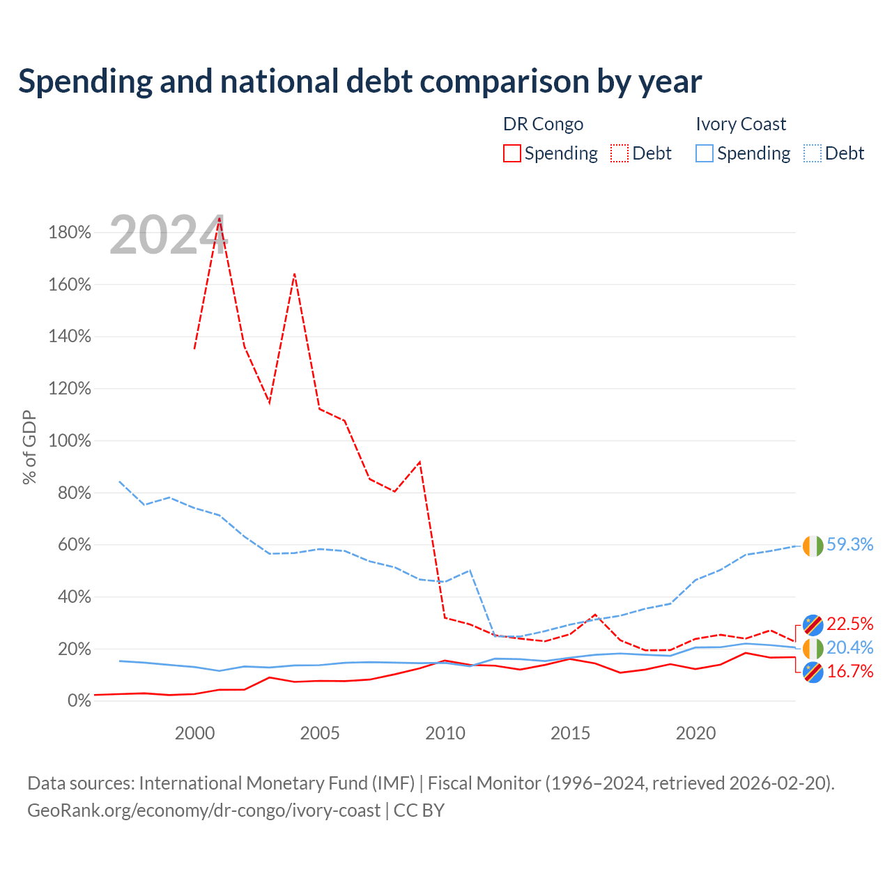 The DR Congo has $16B in government debt (22.5% of GDP), compared to $51.6B (59.3% of GDP) in Ivory Coast.