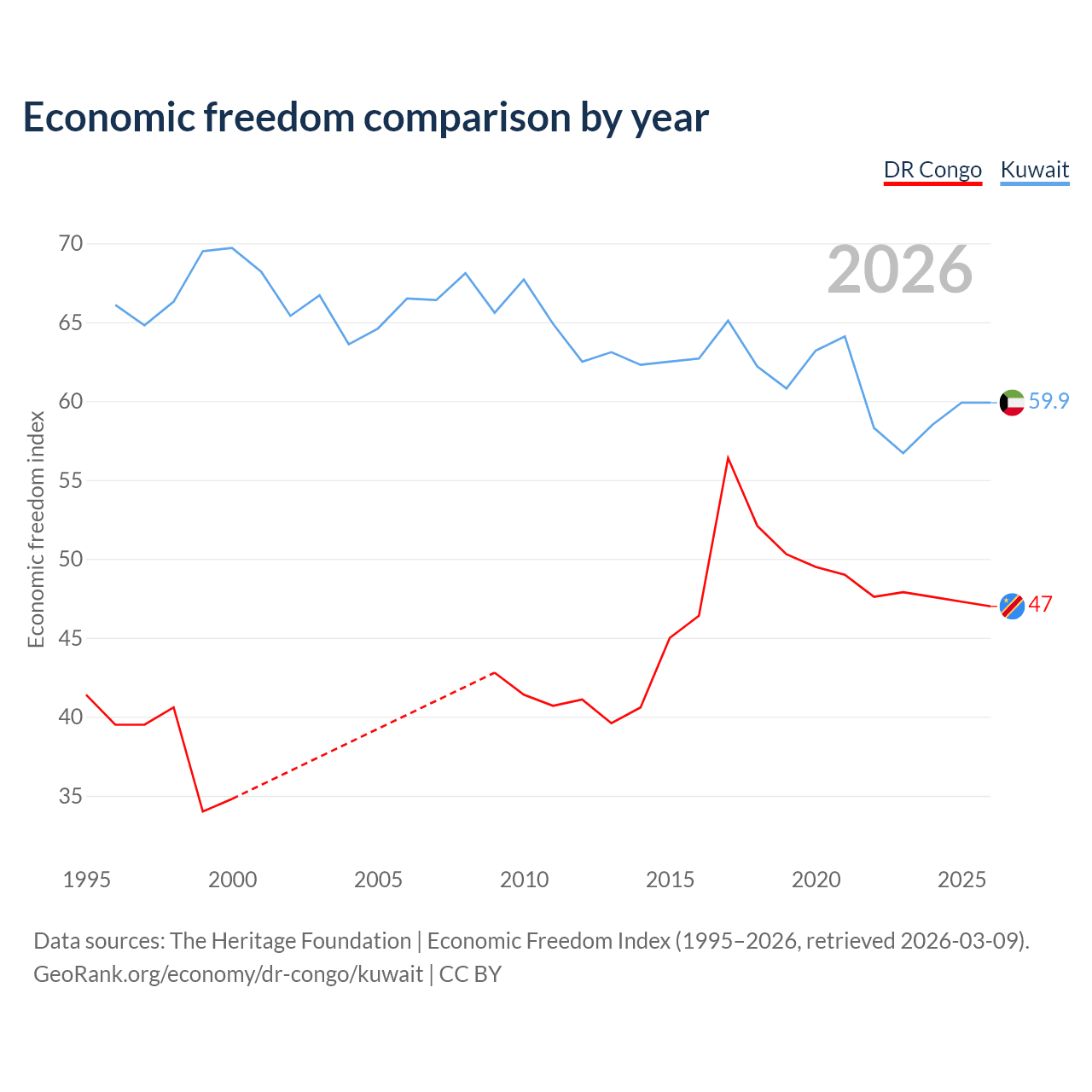 The Economic Freedom Index for the DR Congo is 47, ranking 176/197, compared to 59.9 for Kuwait, ranking 100/197. The chart above displays a comparison of annual changes in economic freedom indexes.