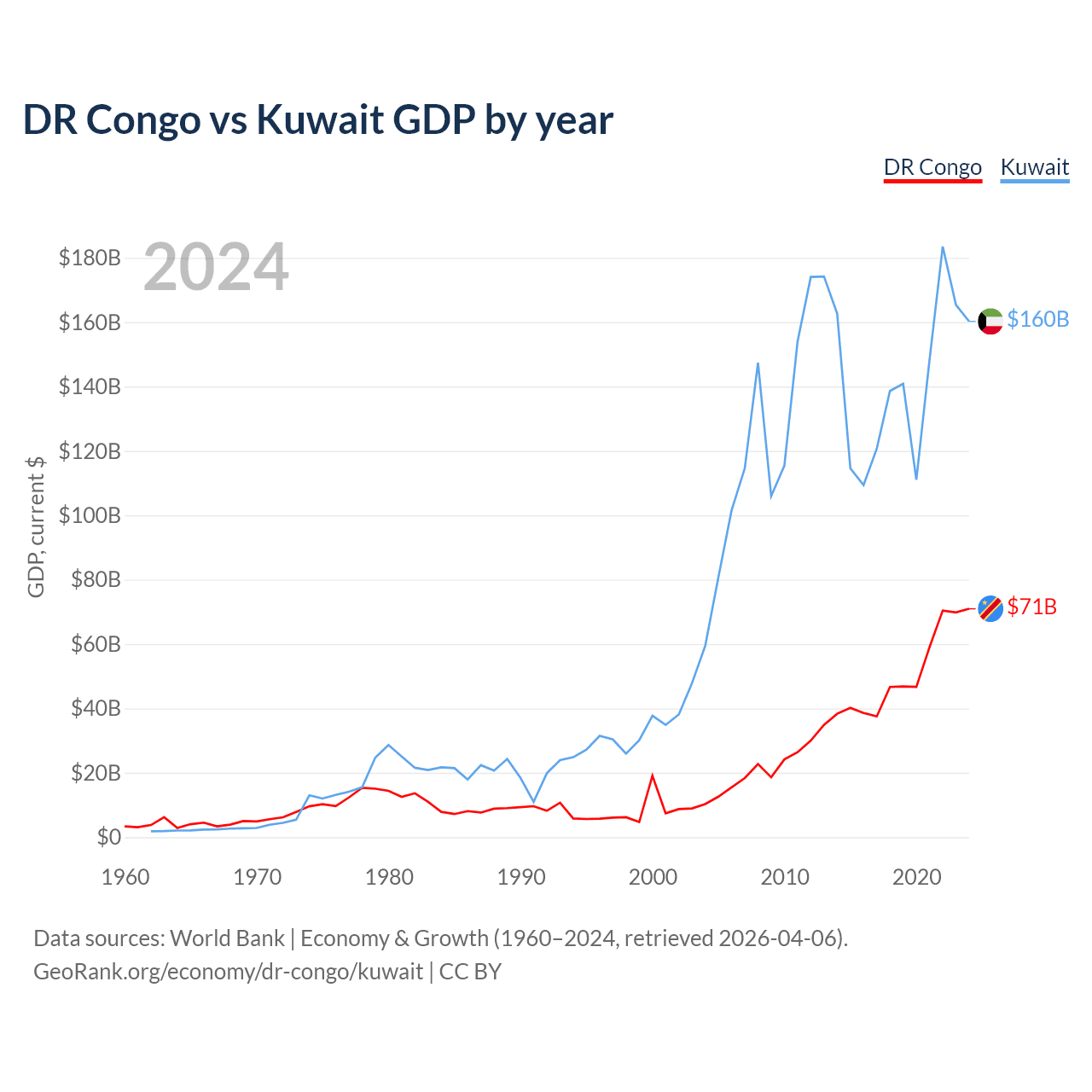 The DR Congo has a GDP of $71B compared to $160B for Kuwait, ranking 87/197 and 59/197 by economy size, respectively.
