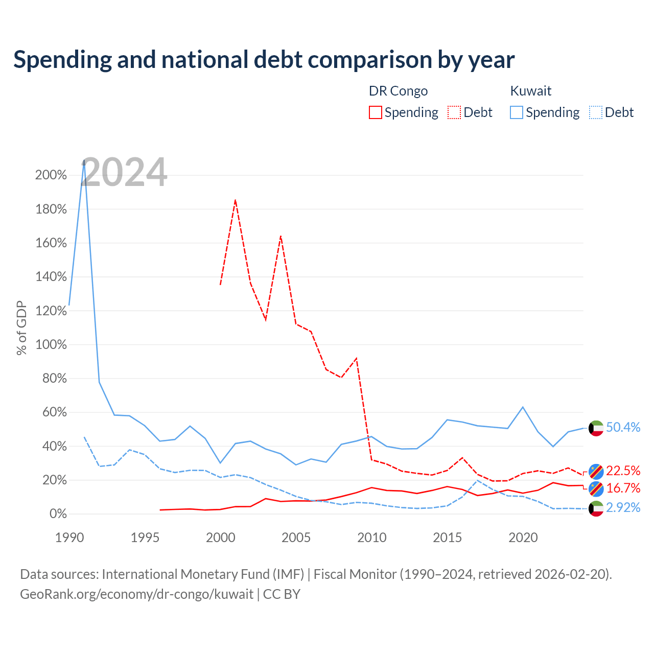 The DR Congo has $16B in government debt (22.5% of GDP), compared to $4.68B (2.92% of GDP) in Kuwait.