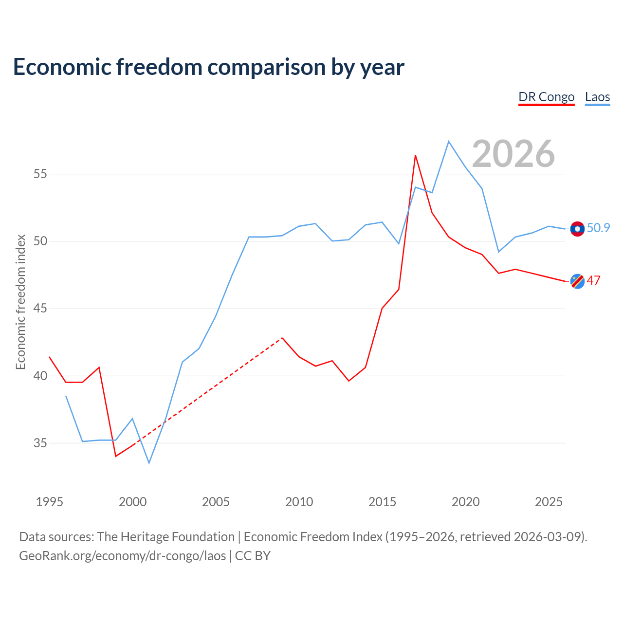 The Economic Freedom Index for the DR Congo is 47, ranking 176/197, compared to 50.9 for Laos, ranking 157/197. The chart above displays a comparison of annual changes in economic freedom indexes.