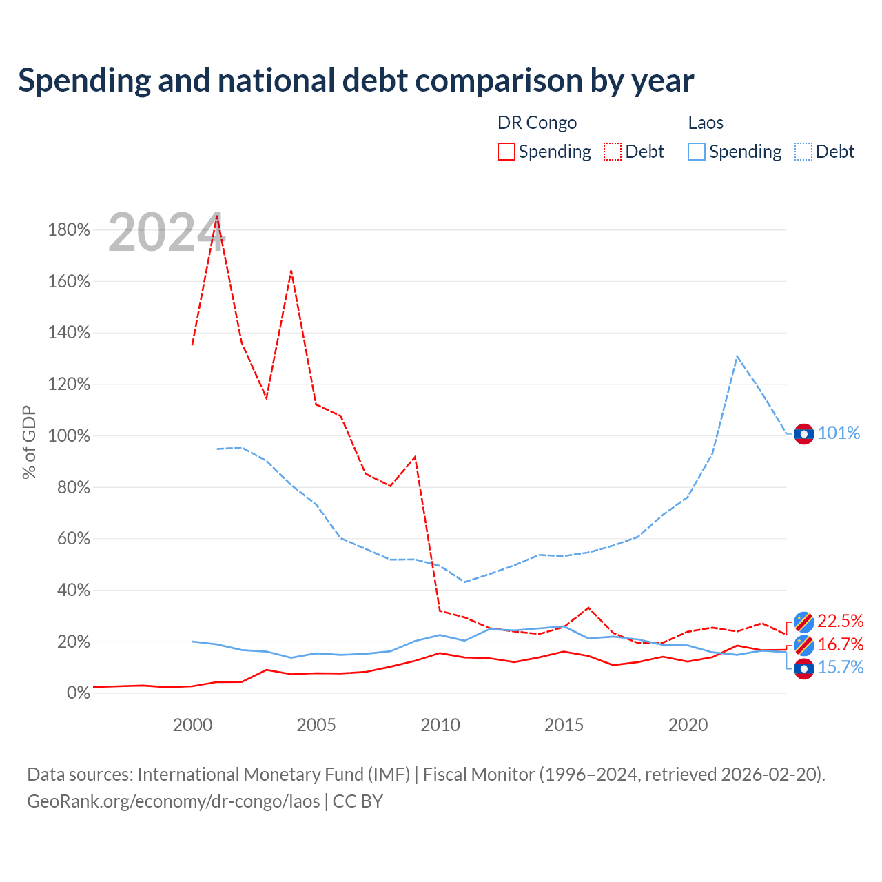 The DR Congo has $16B in government debt (22.5% of GDP), compared to $16.6B (100.5% of GDP) in Laos.