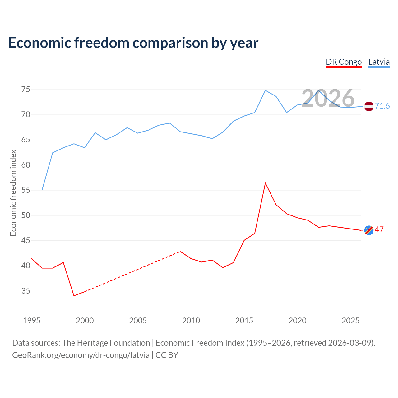 The Economic Freedom Index for the DR Congo is 47, ranking 176/197, compared to 71.6 for Latvia, ranking 31/197. The chart above displays a comparison of annual changes in economic freedom indexes.