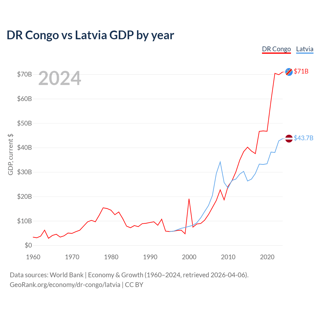 The DR Congo has a GDP of $71B compared to $43.7B for Latvia, ranking 87/197 and 99/197 by economy size, respectively.