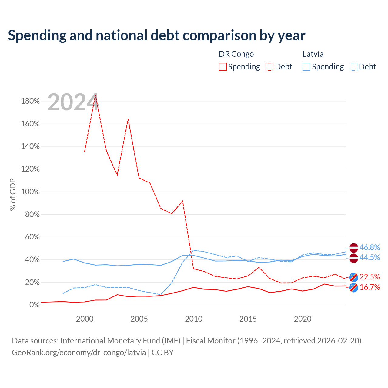The DR Congo has $16B in government debt (22.5% of GDP), compared to $20.4B (46.8% of GDP) in Latvia.