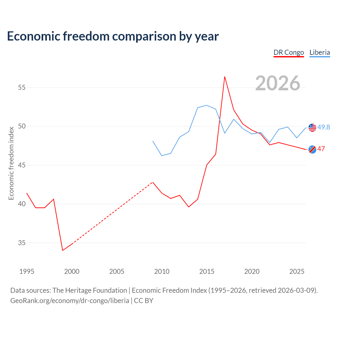 The Economic Freedom Index for the DR Congo is 47, ranking 176/197, compared to 49.8 for Liberia, ranking 163/197. The chart above displays a comparison of annual changes in economic freedom indexes.