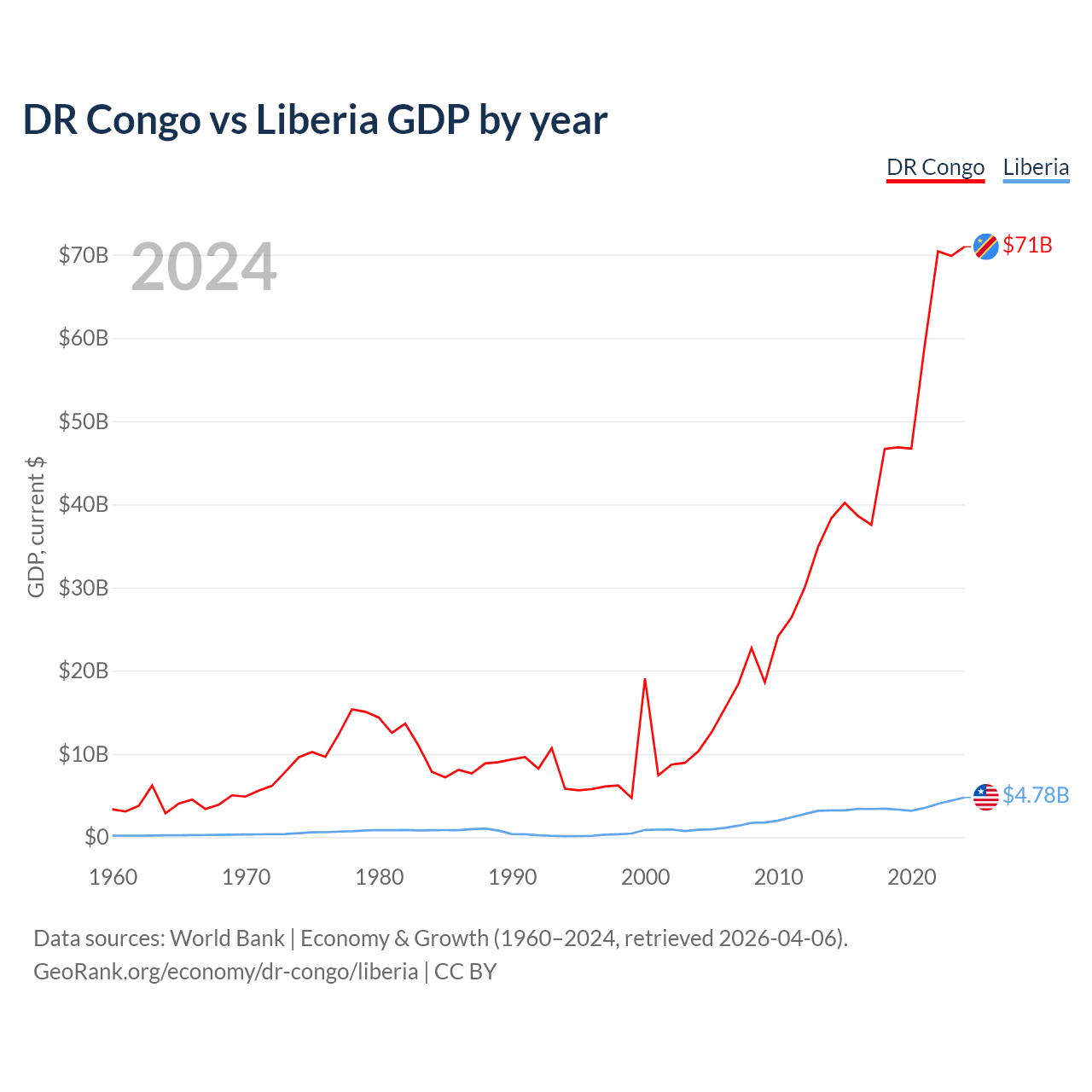 The DR Congo has a GDP of $71B compared to $4.78B for Liberia, ranking 87/197 and 163/197 by economy size, respectively.