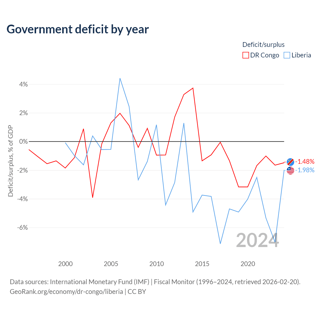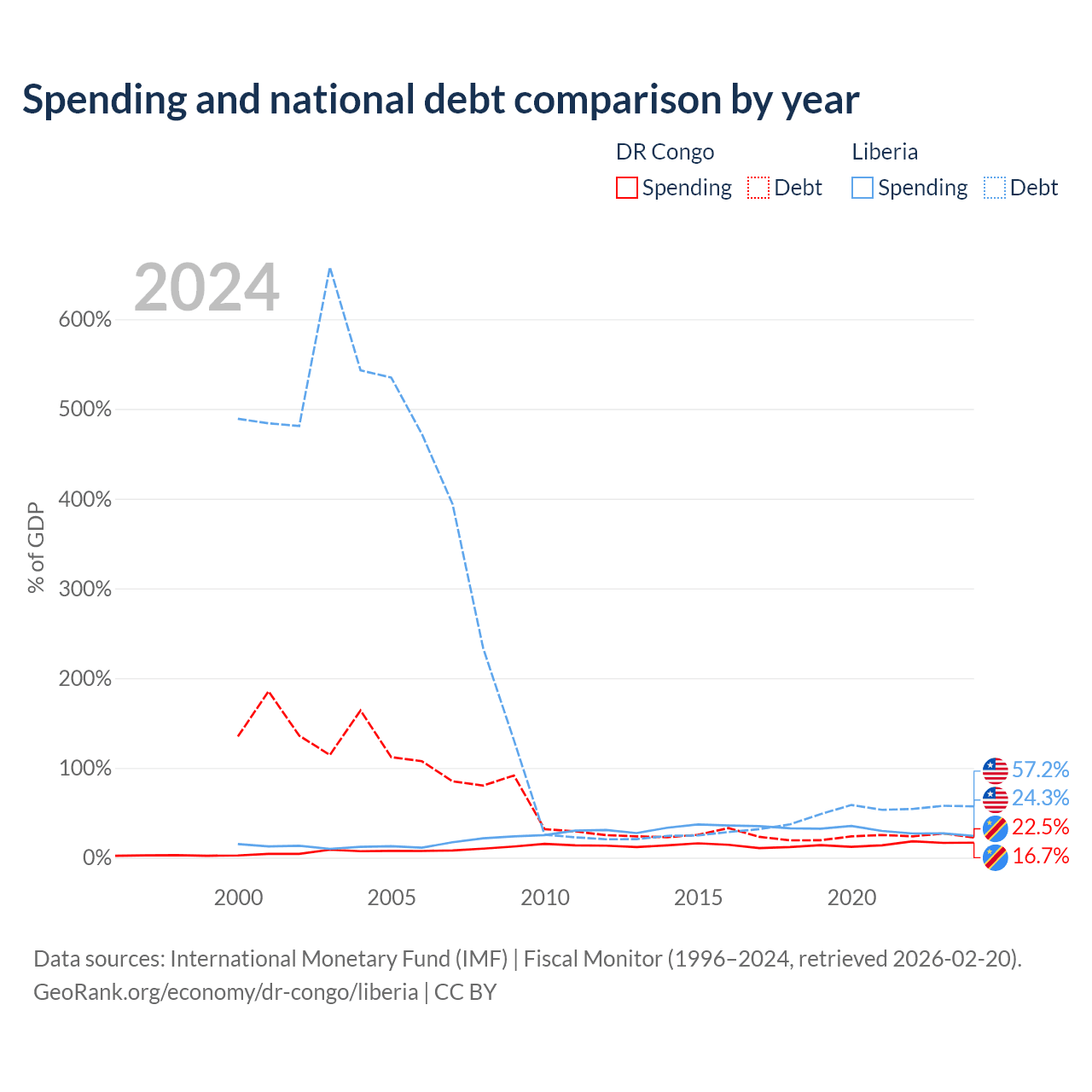 The DR Congo has $16B in government debt (22.5% of GDP), compared to $2.73B (57.2% of GDP) in Liberia.