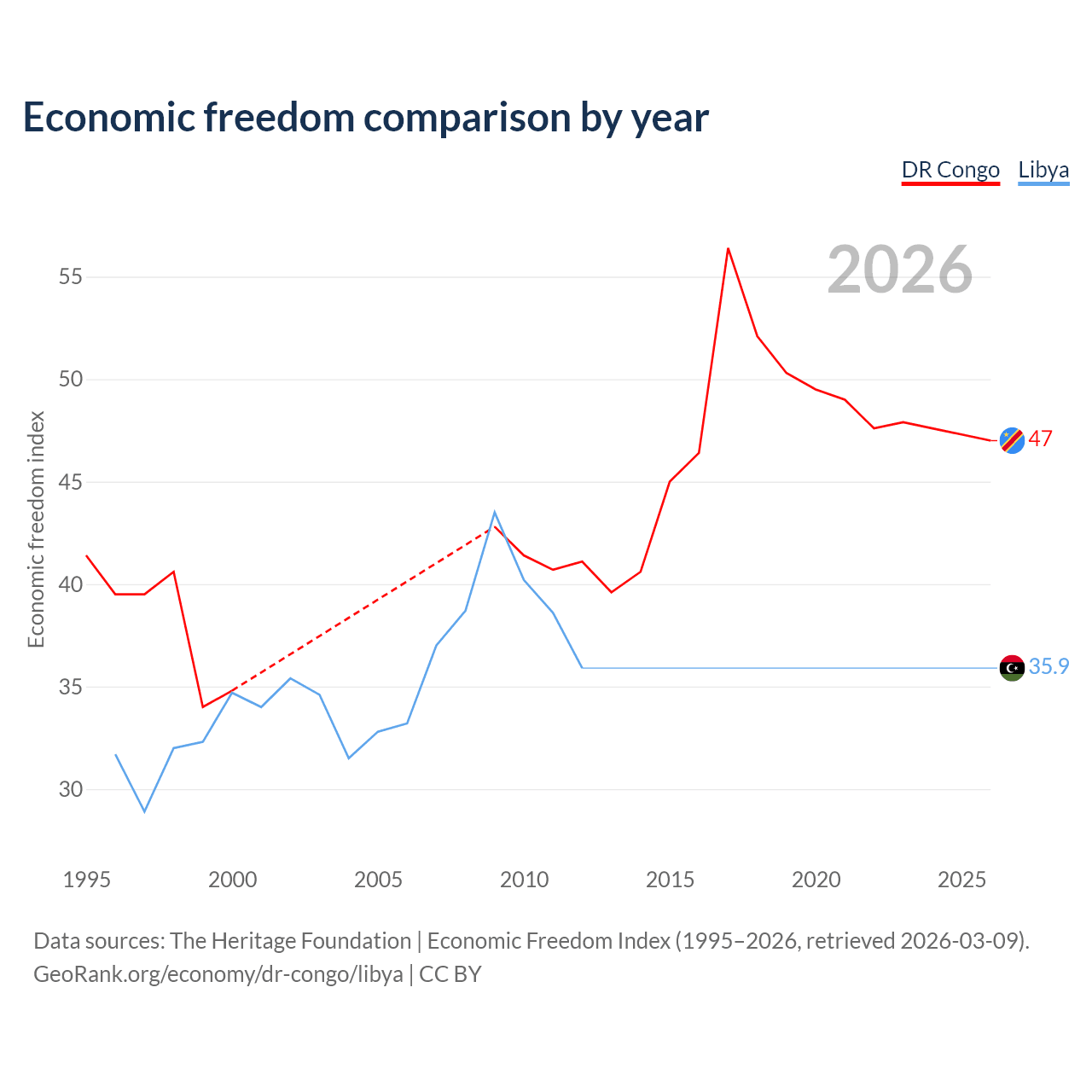 The Economic Freedom Index for the DR Congo is 47, ranking 176/197, compared to 35.9 for Libya, ranking 189/197. The chart above displays a comparison of annual changes in economic freedom indexes.