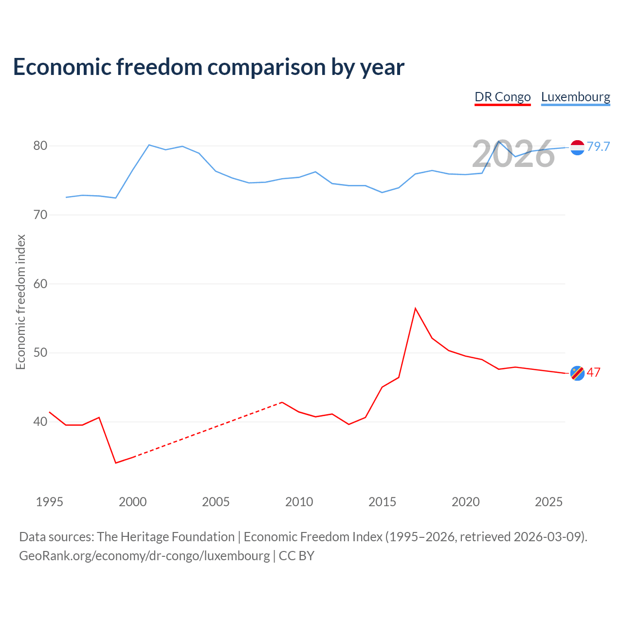 The Economic Freedom Index for the DR Congo is 47, ranking 176/197, compared to 79.7 for Luxembourg, ranking 7/197. The chart above displays a comparison of annual changes in economic freedom indexes.