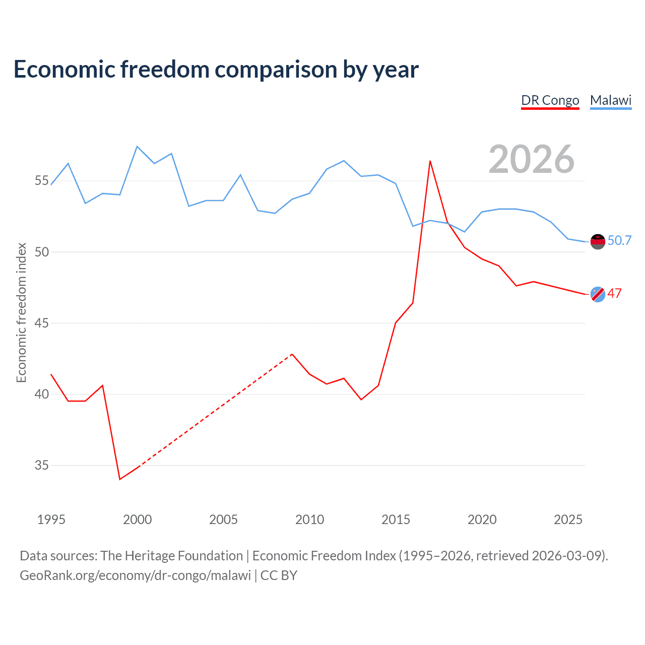 The Economic Freedom Index for the DR Congo is 47, ranking 176/197, compared to 50.7 for Malawi, ranking 159/197. The chart above displays a comparison of annual changes in economic freedom indexes.