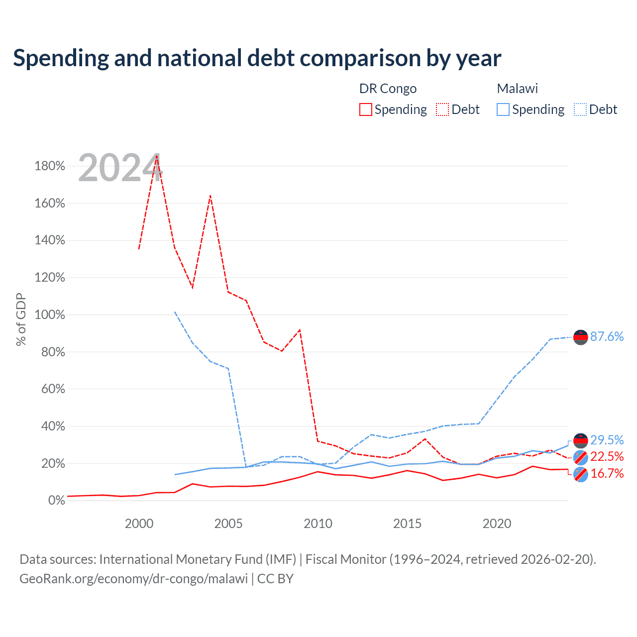 The DR Congo has $16B in government debt (22.5% of GDP), compared to $9.91B (87.6% of GDP) in Malawi.