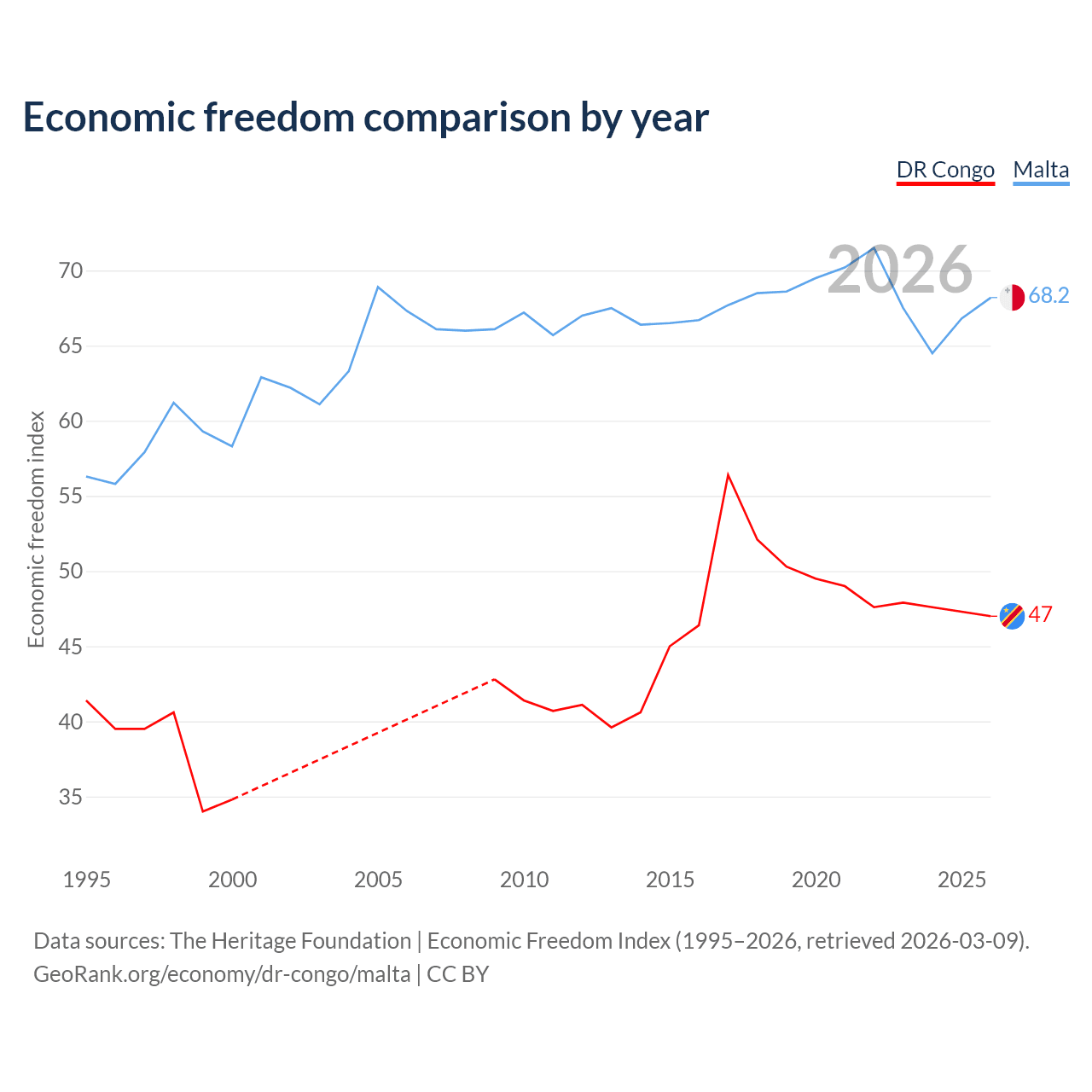 The Economic Freedom Index for the DR Congo is 47, ranking 176/197, compared to 68.2 for Malta, ranking 49/197. The chart above displays a comparison of annual changes in economic freedom indexes.