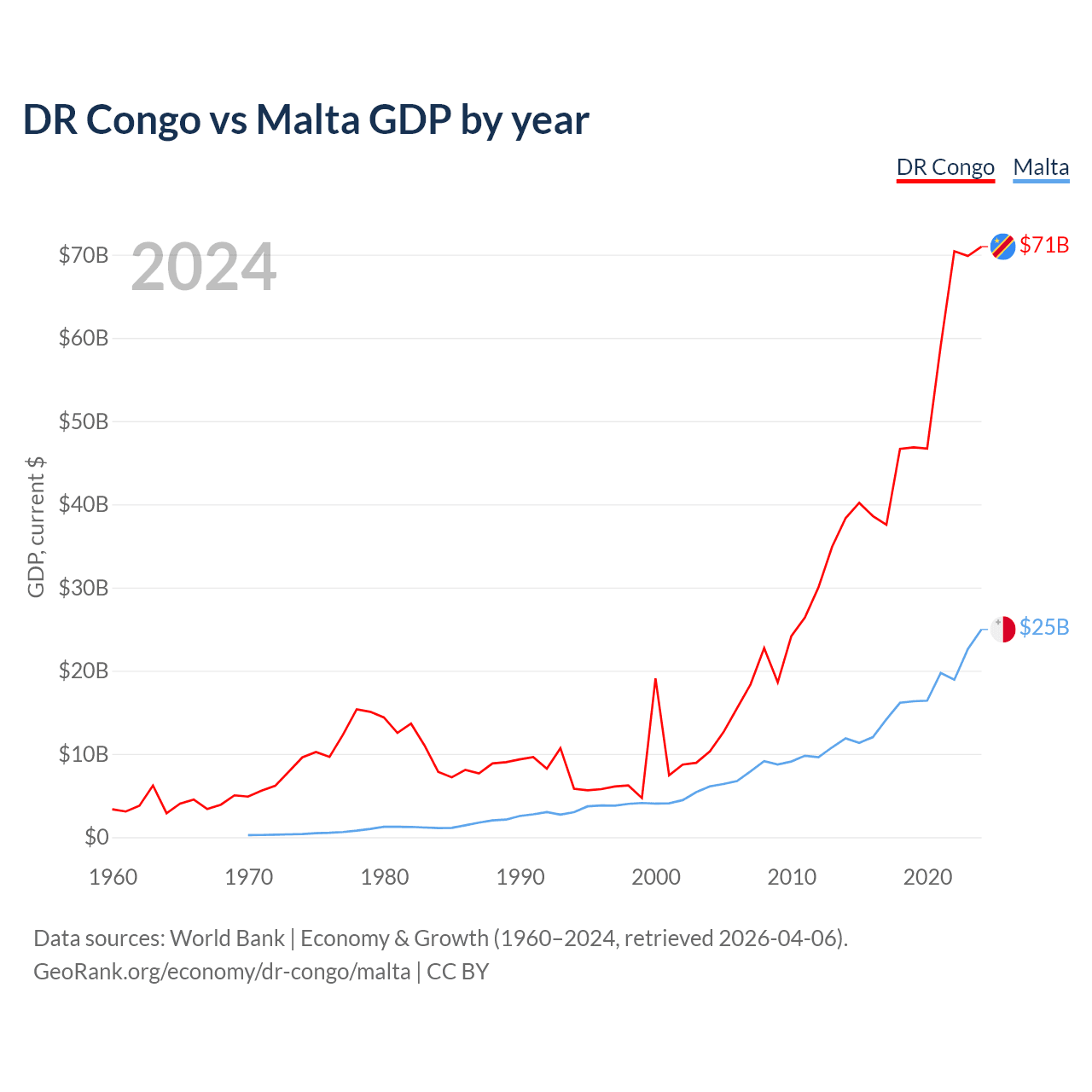 The DR Congo has a GDP of $71B compared to $25B for Malta, ranking 87/197 and 119/197 by economy size, respectively.