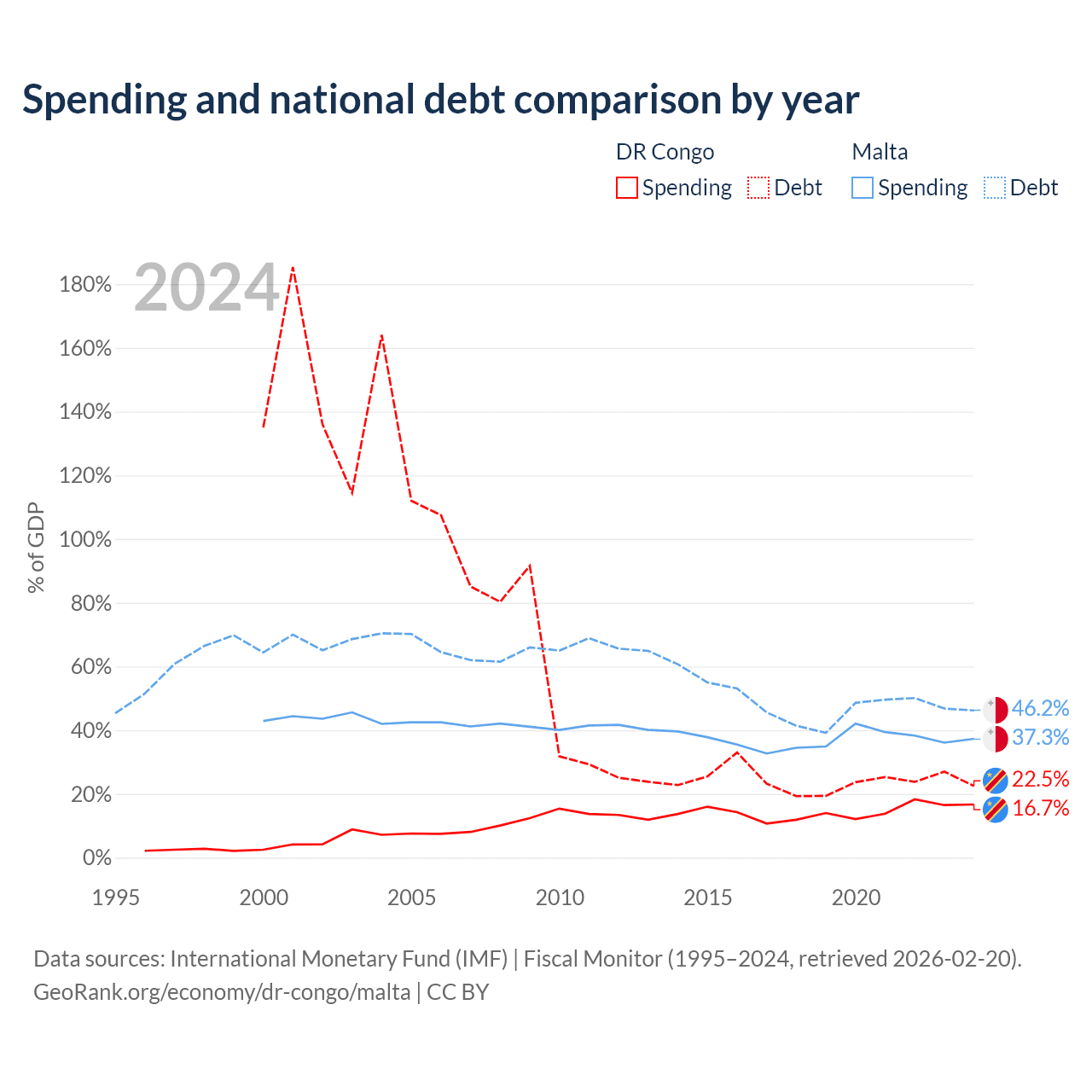 The DR Congo has $16B in government debt (22.5% of GDP), compared to $11.5B (46.2% of GDP) in Malta.