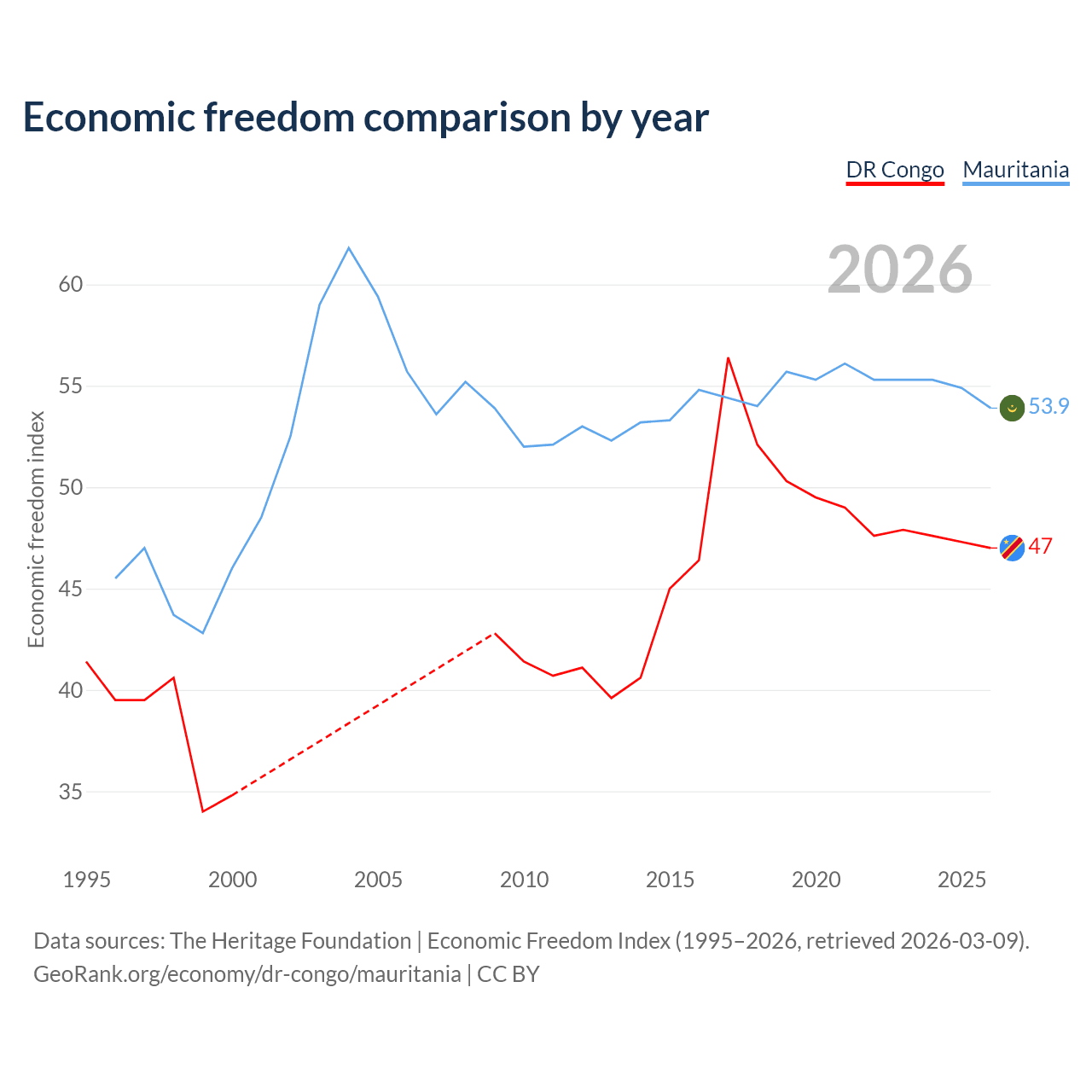 The Economic Freedom Index for the DR Congo is 47, ranking 176/197, compared to 53.9 for Mauritania, ranking 136/197. The chart above displays a comparison of annual changes in economic freedom indexes.