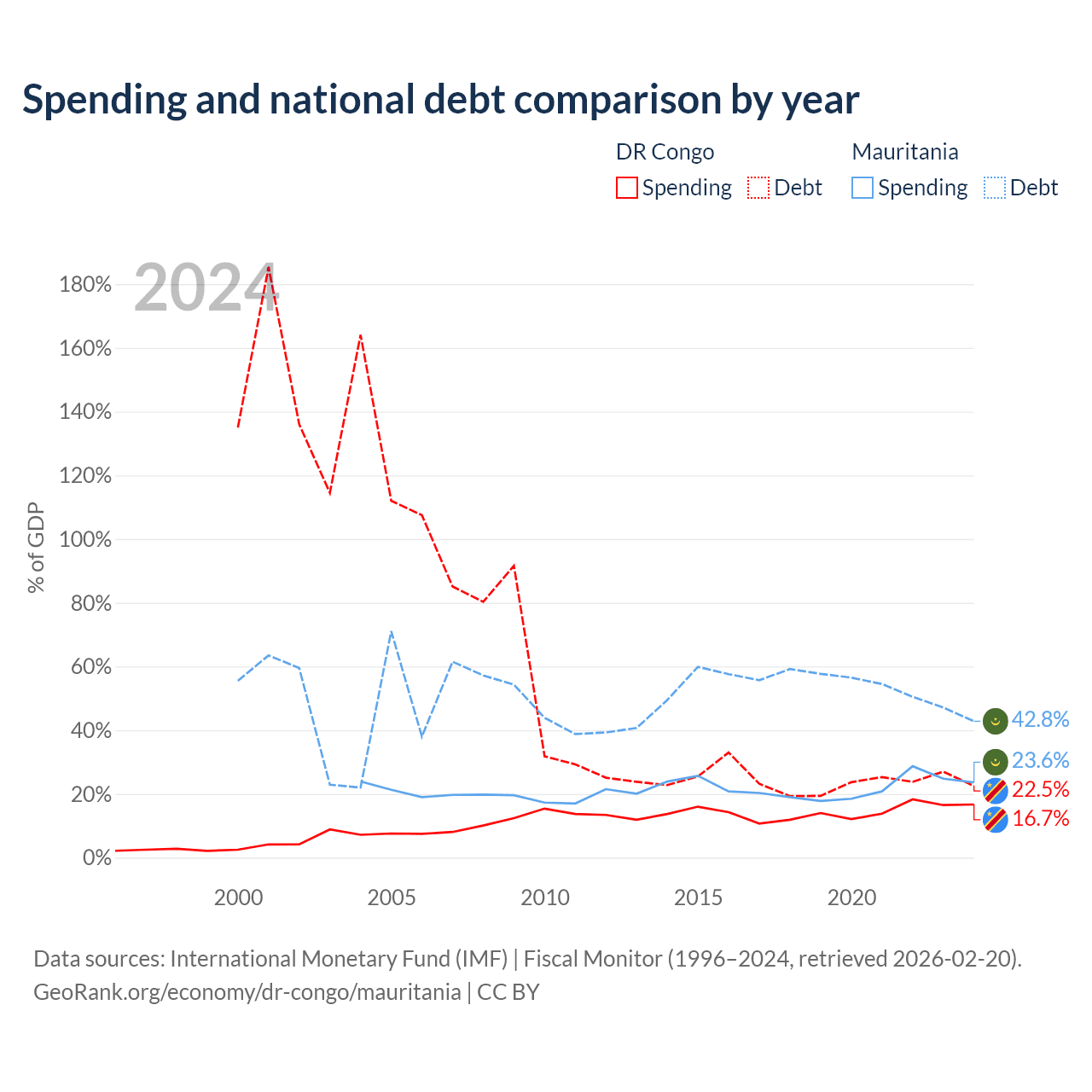 The DR Congo has $16B in government debt (22.5% of GDP), compared to $4.67B (42.8% of GDP) in Mauritania.
