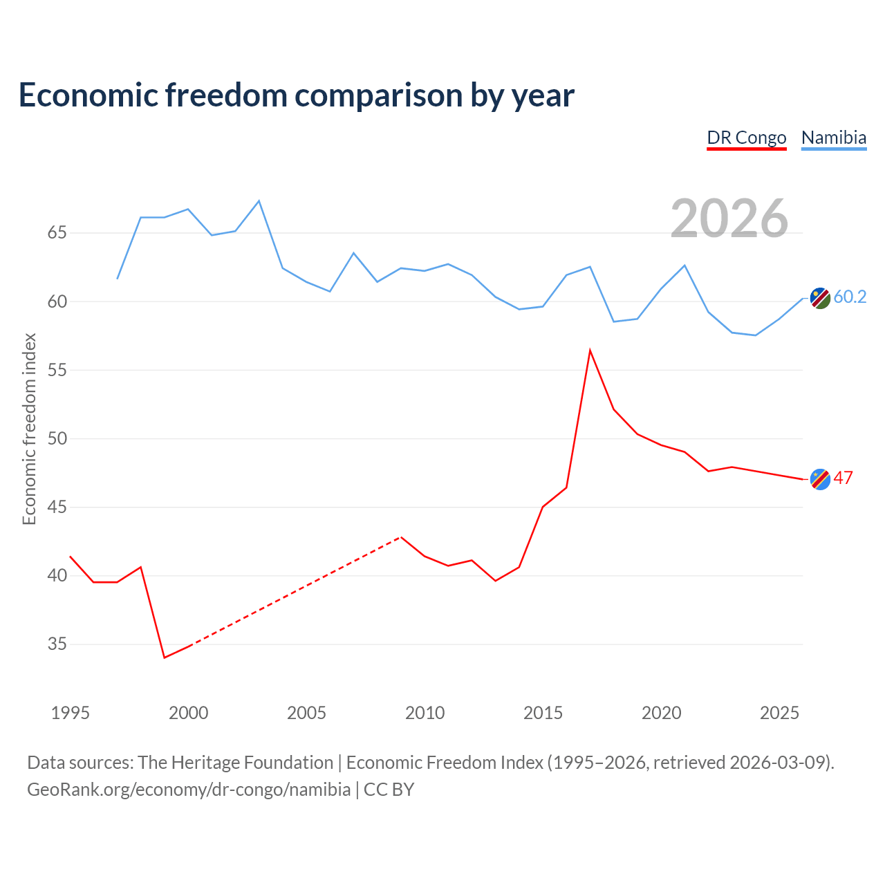 The Economic Freedom Index for the DR Congo is 47, ranking 176/197, compared to 60.2 for Namibia, ranking 95/197. The chart above displays a comparison of annual changes in economic freedom indexes.