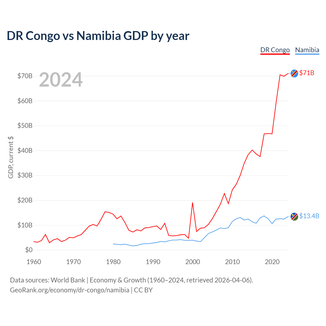 The DR Congo has a GDP of $71B compared to $13.4B for Namibia, ranking 87/197 and 147/197 by economy size, respectively.