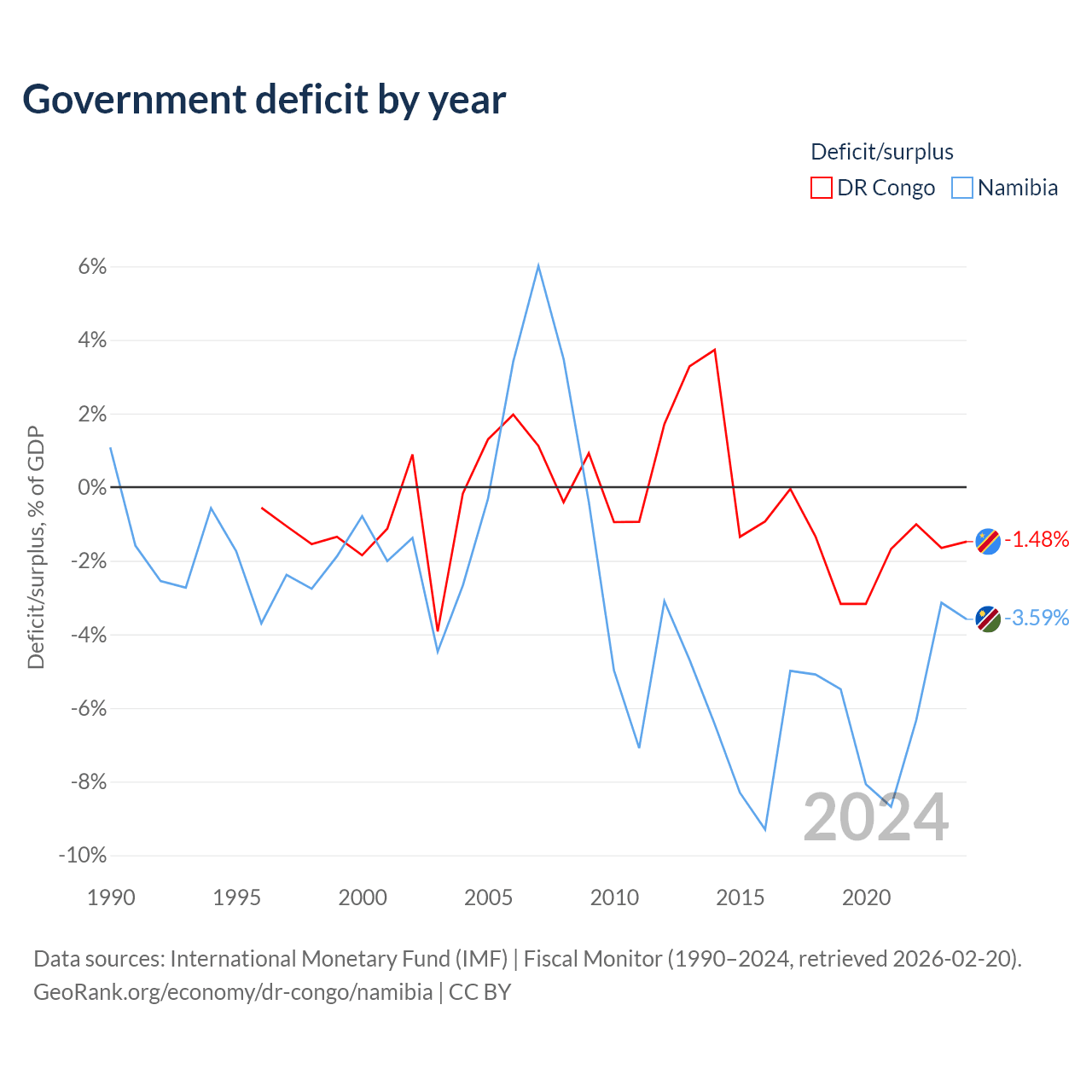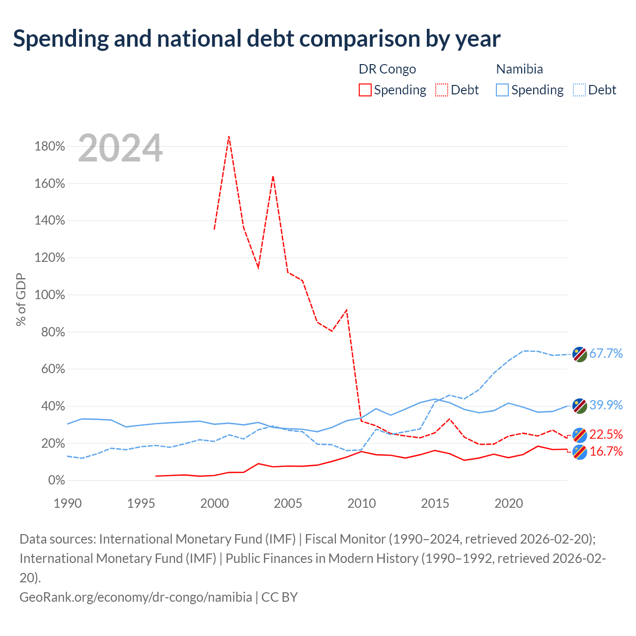 The DR Congo has $16B in government debt (22.5% of GDP), compared to $9.05B (67.7% of GDP) in Namibia.