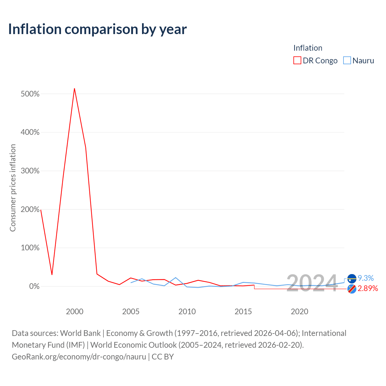 Over the past 12 years, the DR Congo has recorded an average annual inflation rate of 9.1%, compared with 5.75% in Nauru. In 2016, inflation was 2.89% in the DR Congo and 9.3% in Nauru.
