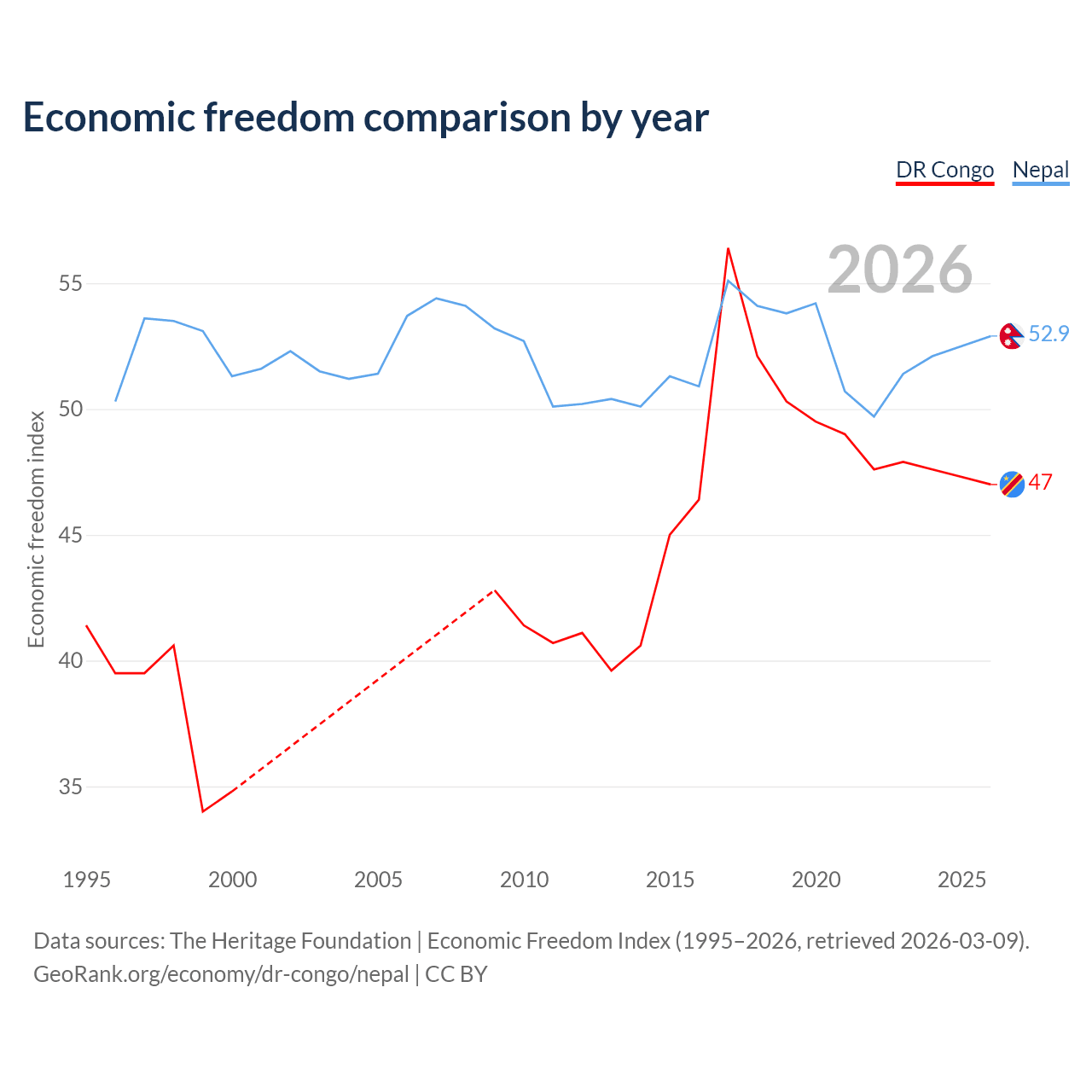 The Economic Freedom Index for the DR Congo is 47, ranking 176/197, compared to 52.9 for Nepal, ranking 144/197. The chart above displays a comparison of annual changes in economic freedom indexes.