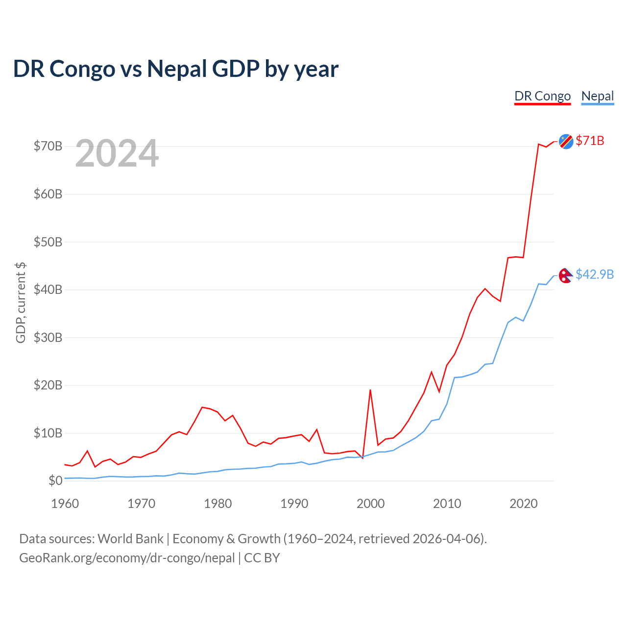 The DR Congo has a GDP of $71B compared to $42.9B for Nepal, ranking 87/197 and 101/197 by economy size, respectively.