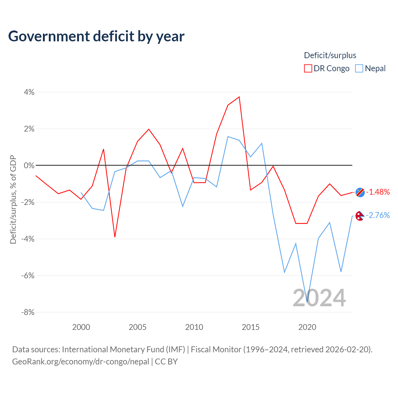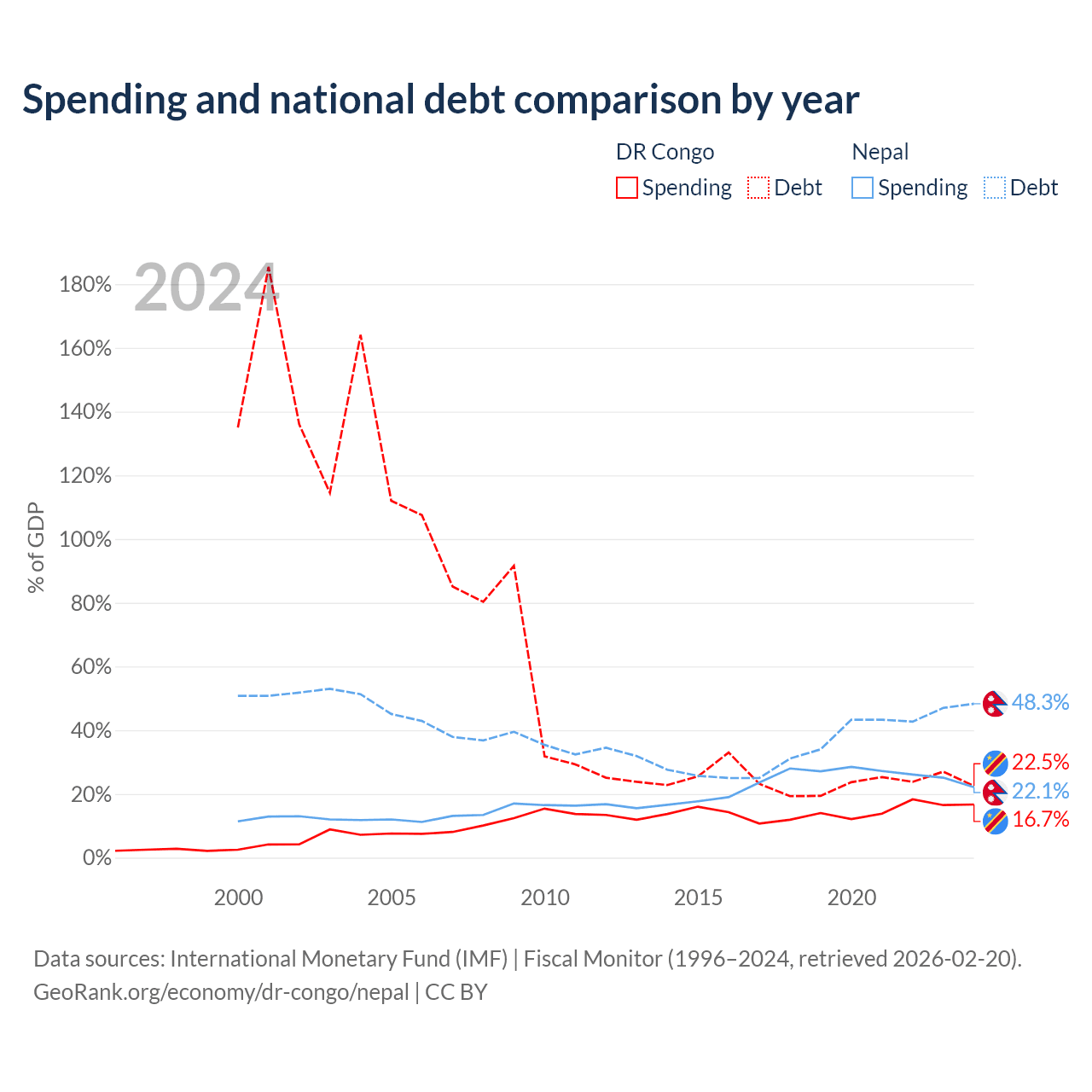 The DR Congo has $16B in government debt (22.5% of GDP), compared to $20.7B (48.3% of GDP) in Nepal.