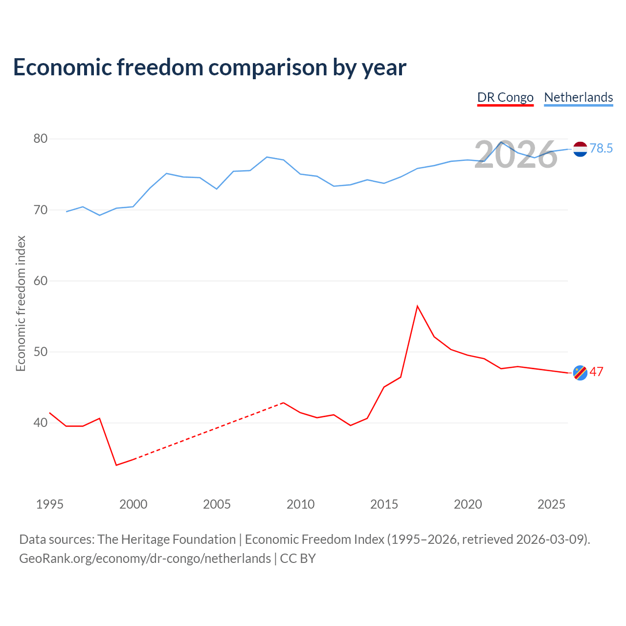 The Economic Freedom Index for the DR Congo is 47, ranking 176/197, compared to 78.5 for the Netherlands, ranking 11/197. The chart above displays a comparison of annual changes in economic freedom indexes.