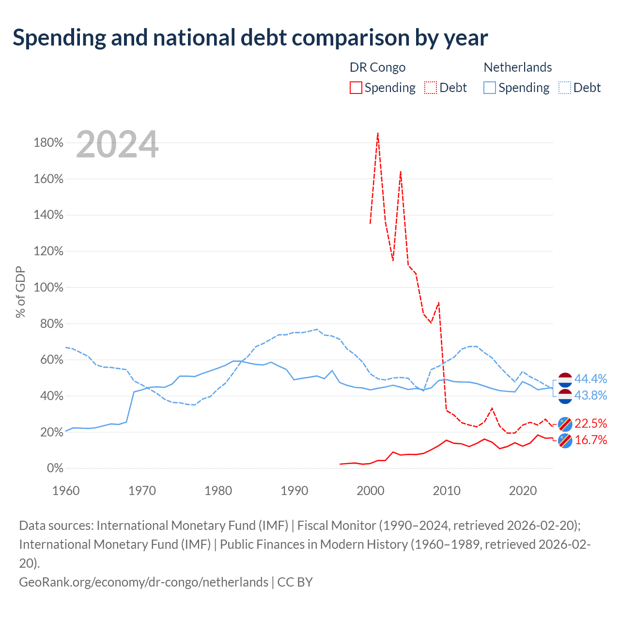 The DR Congo has $16B in government debt (22.5% of GDP), compared to $532B (43.8% of GDP) in the Netherlands.