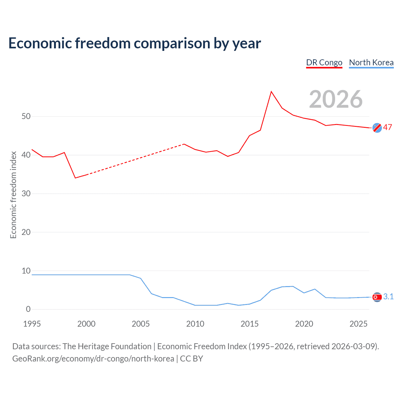 The Economic Freedom Index for the DR Congo is 47, ranking 176/197, compared to 3.1 for North Korea, ranking 197/197. The chart above displays a comparison of annual changes in economic freedom indexes.
