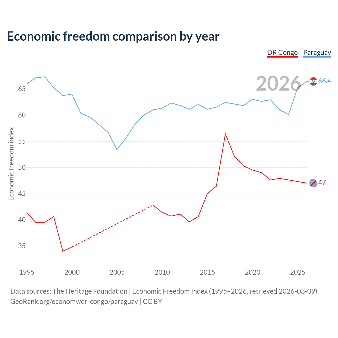 The Economic Freedom Index for the DR Congo is 47, ranking 176/197, compared to 66.4 for Paraguay, ranking 61/197. The chart above displays a comparison of annual changes in economic freedom indexes.