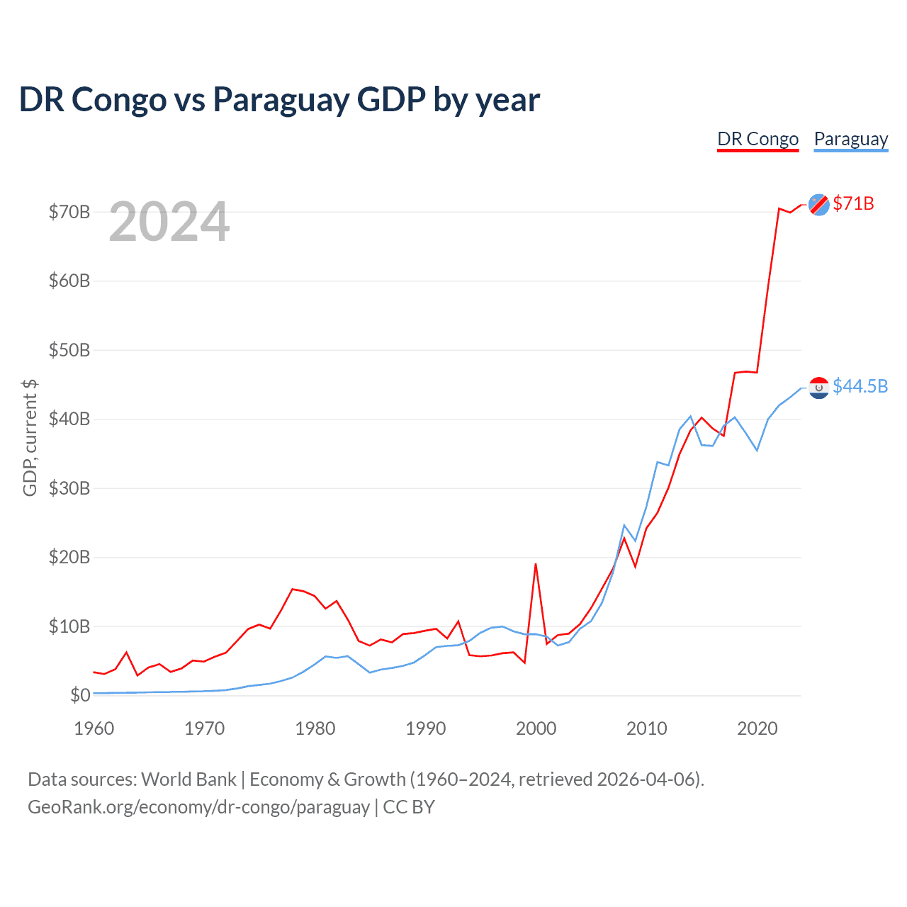 The DR Congo has a GDP of $71B compared to $44.5B for Paraguay, ranking 87/197 and 98/197 by economy size, respectively.