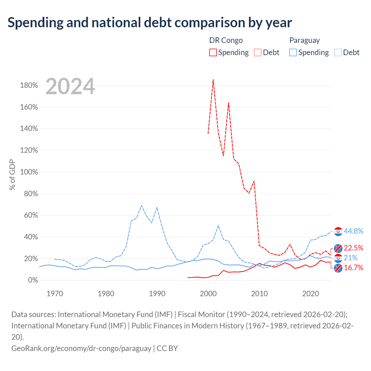 The DR Congo has $16B in government debt (22.5% of GDP), compared to $19.9B (44.8% of GDP) in Paraguay.