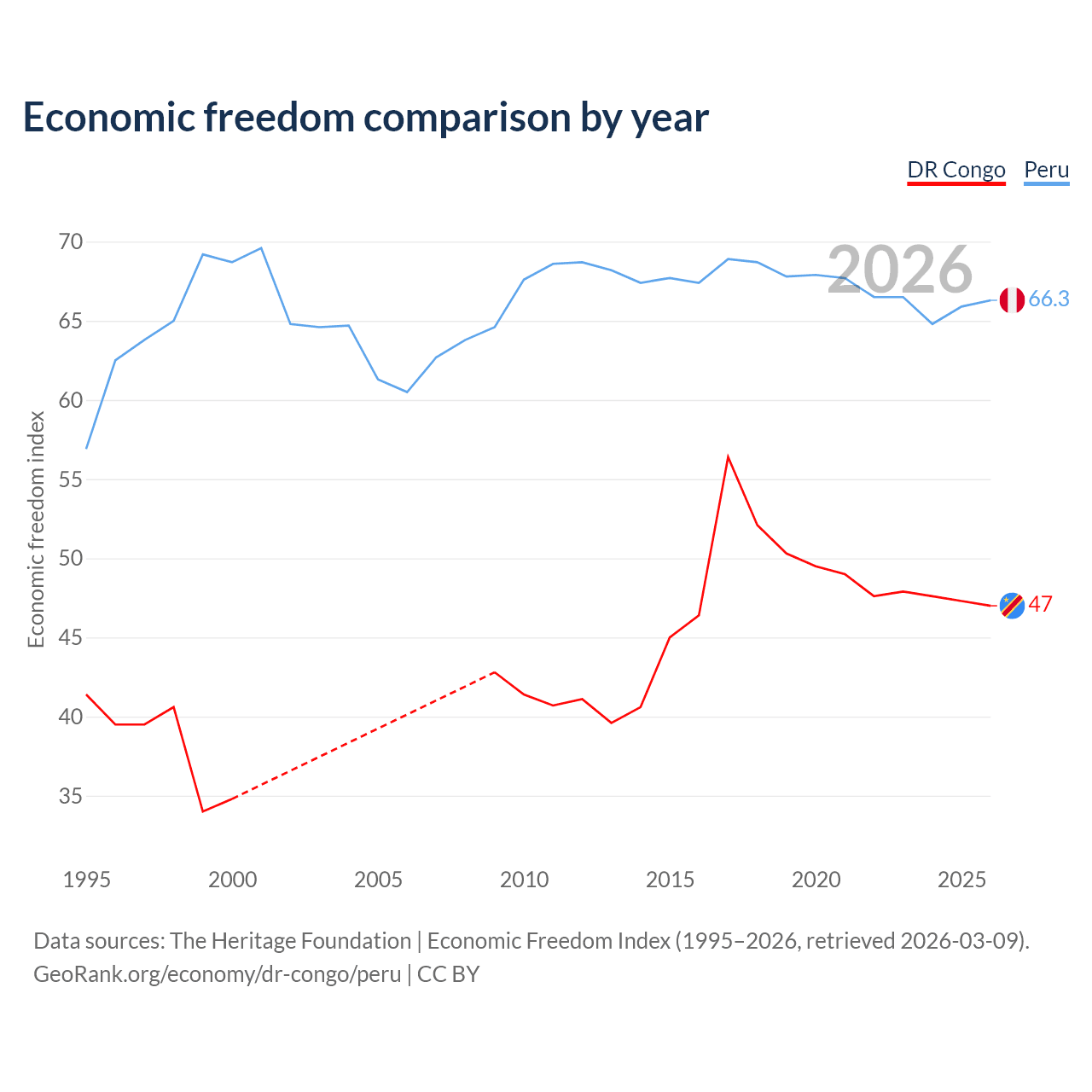 The Economic Freedom Index for the DR Congo is 47, ranking 176/197, compared to 66.3 for Peru, ranking 62/197. The chart above displays a comparison of annual changes in economic freedom indexes.