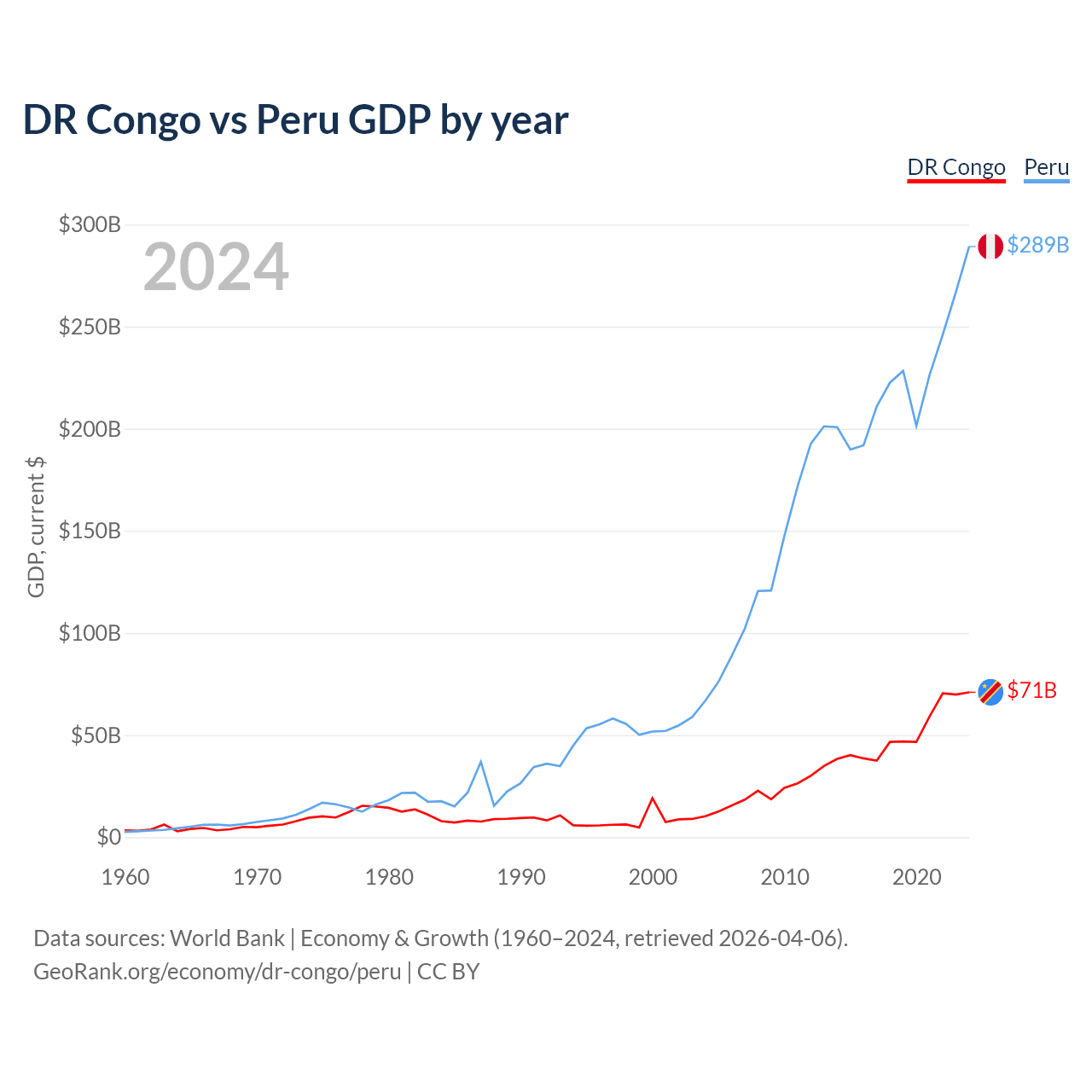 The DR Congo has a GDP of $71B compared to $289B for Peru, ranking 87/197 and 49/197 by economy size, respectively.