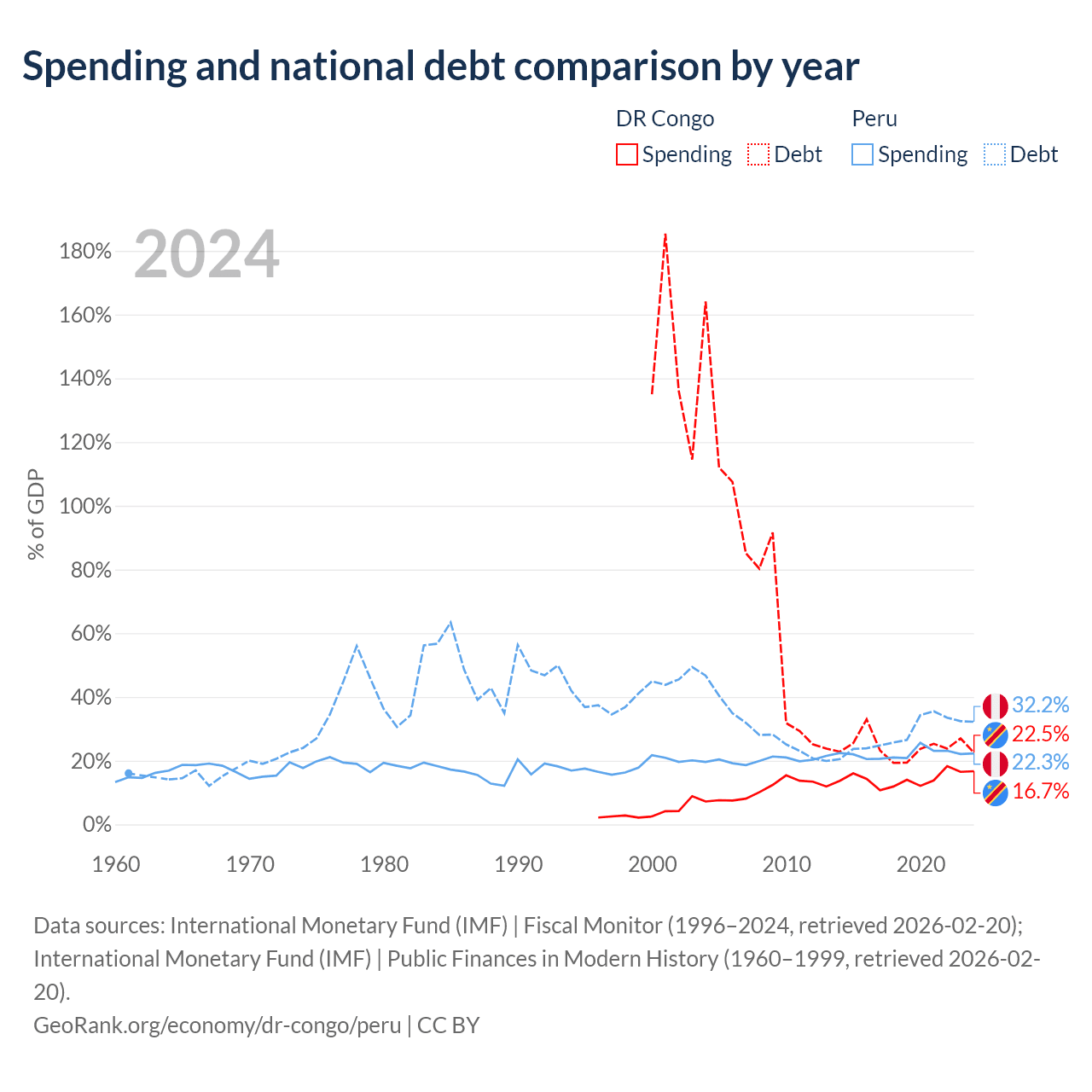The DR Congo has $16B in government debt (22.5% of GDP), compared to $93B (32.2% of GDP) in Peru.