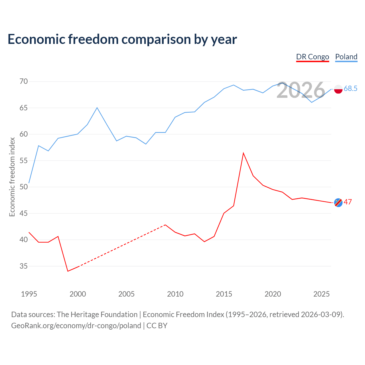 The Economic Freedom Index for the DR Congo is 47, ranking 176/197, compared to 68.5 for Poland, ranking 46/197. The chart above displays a comparison of annual changes in economic freedom indexes.