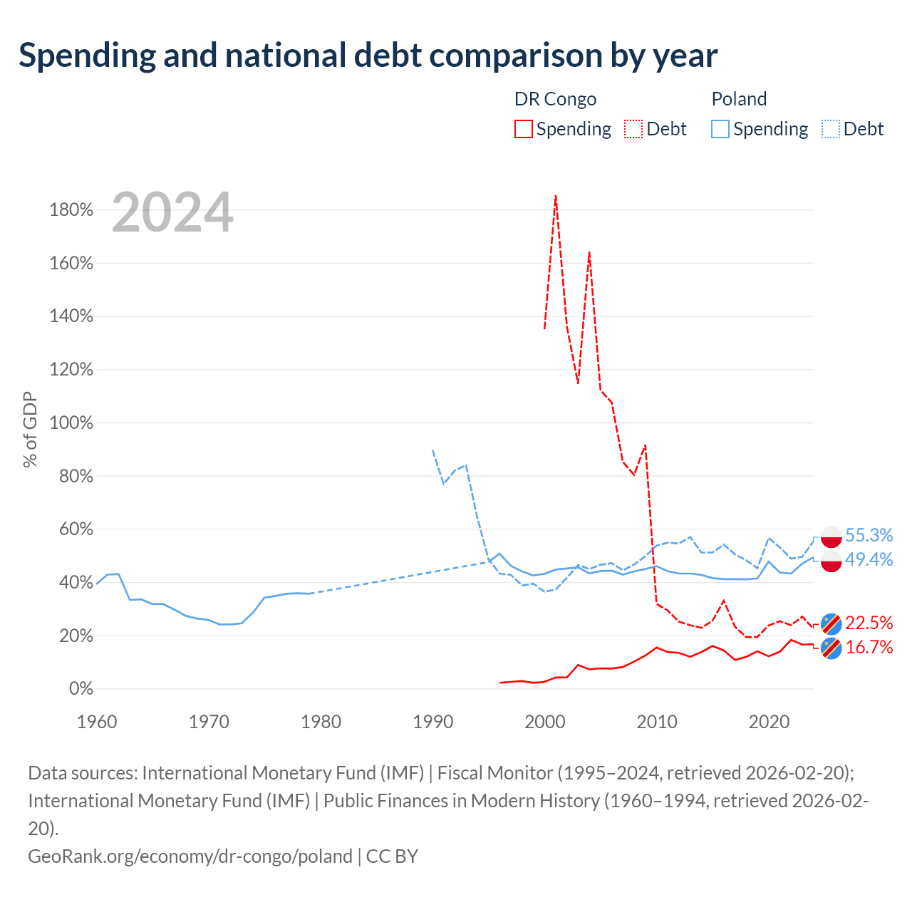 The DR Congo has $16B in government debt (22.5% of GDP), compared to $507B (55.3% of GDP) in Poland.