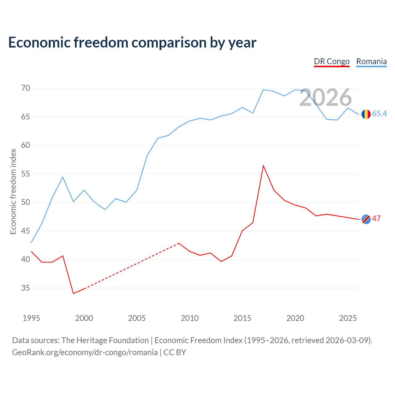 The Economic Freedom Index for the DR Congo is 47, ranking 176/197, compared to 65.4 for Romania, ranking 64/197. The chart above displays a comparison of annual changes in economic freedom indexes.