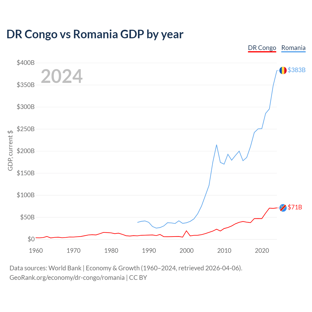DR Congo vs Romania GDP by year