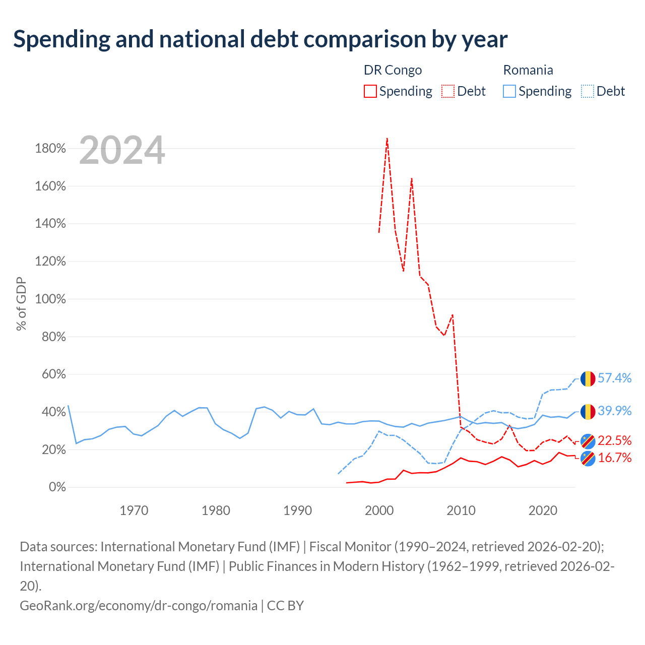 The DR Congo has $16B in government debt (22.5% of GDP), compared to $220B (57.4% of GDP) in Romania.
